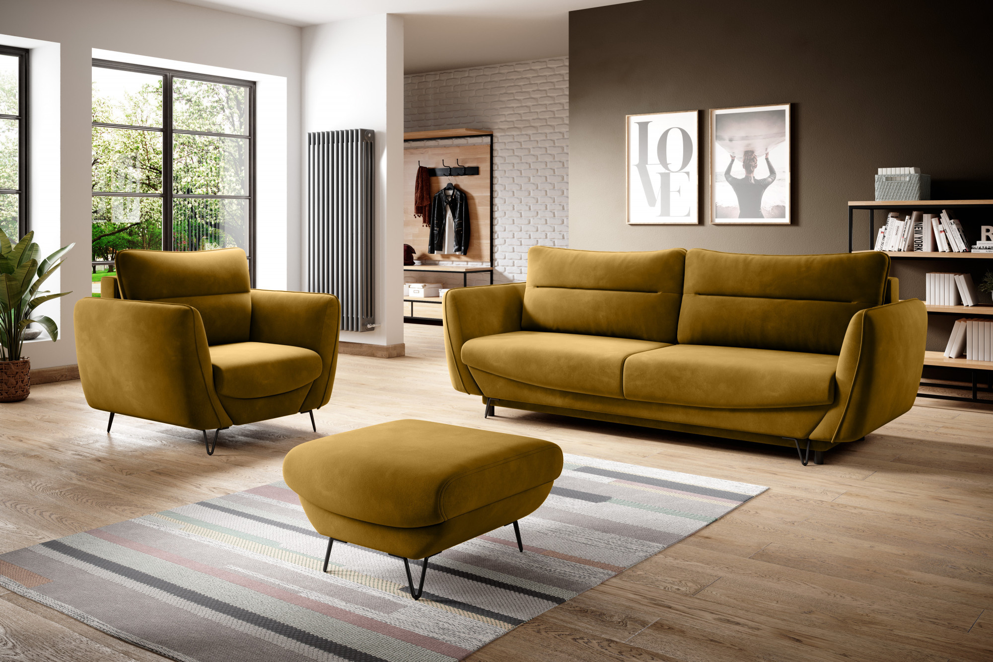 Sada Silva je 3dílná sada, která zahrnuje pohovku, křeslo a taburet. Nábytek je čalouněný a má krásný přírodní povrch. Jejich jedinečnost je umocněna moderními černými ocelovými nohami, které mají velmi neobvyklý vzhled. Díky tomu se jednoduché kusy nábytku stávají více designovými. Při výběru sady Silva je možné vsadit na jednu z mnoha krásných barev čalounění. Kromě toho je nábytek ze sady Silva také velmi pohodlný a praktický, což zajišťuje vlnitá pružina a vysoce elastická HR pěna, kterými jsou sedáky nábytku vybaveny. V opěradle pohovky byla použita pěna T25, která má vysokou odolnost proti deformaci. Díky vhodnému designu je nábytek minimalistický, ale velmi pohodlný. Rozměry soupravy vypadají takto - pohovka: 236 x 95 x 90 cm, křeslo: 93 x 95 x 82 cm a taburet: 67 x 67 x 42 cm. Jako by to nestačilo, pohovka má funkci spaní s plochou: 200 x 145 cm a pohodlný mechanismus rozkládání DL. Silva je také vybavena kontejnerem na ložní prádlo. Sedačková souprava Silva je dokonalou kombinací stylu, pohodlí a funkčnosti.