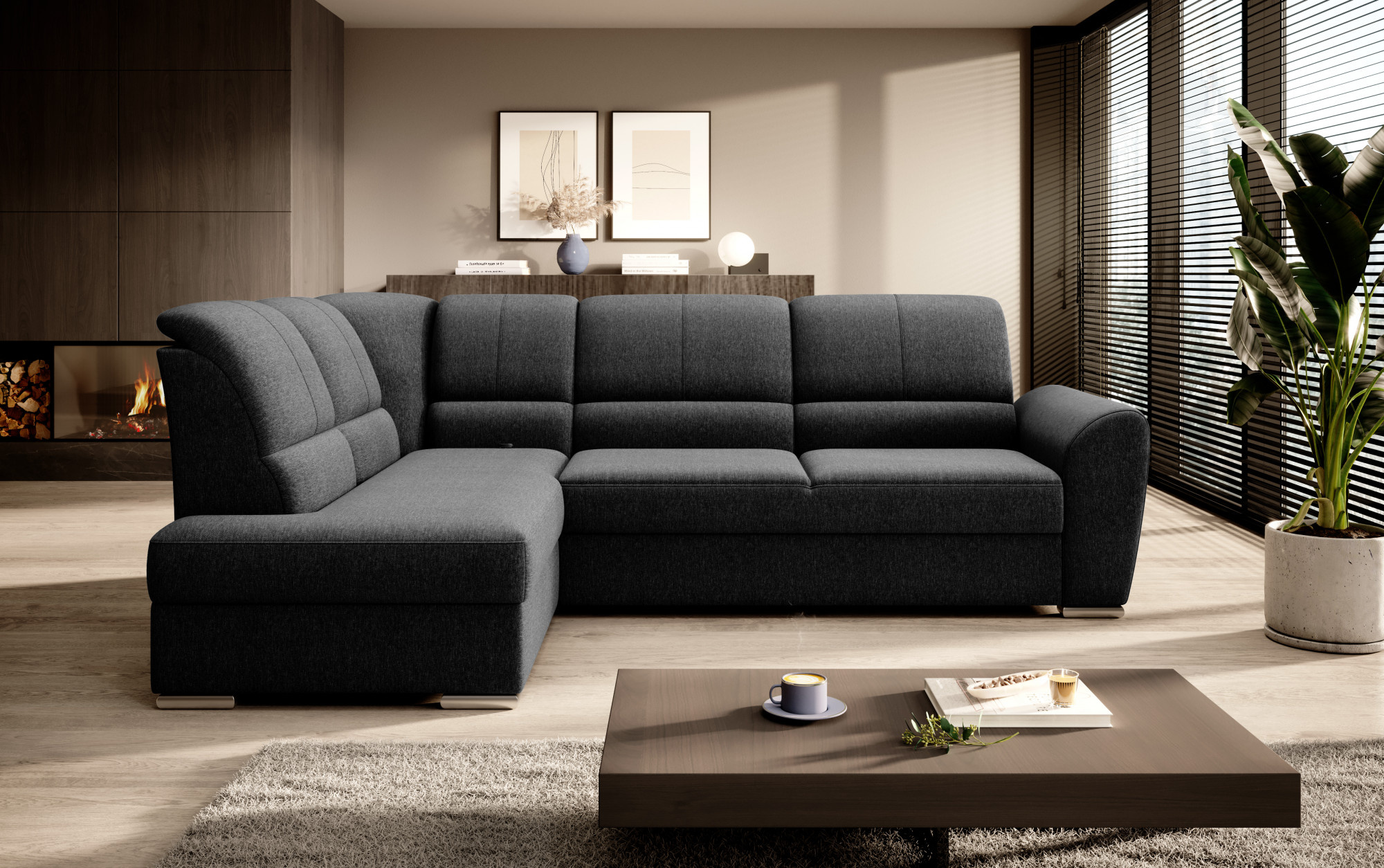 Rohová sedací souprava Siber je ideálním řešením pro ty, kteří si cení pořádku a organizace. Pomáhá šetřit místo díky velkému úložnému prostoru na lůžkoviny. Jeho vysoce profilované nastavitelné opěrky zad, zdobené stylovým prošíváním, zajistí, že i hodiny relaxace u vašeho oblíbeného televizního seriálu budou pohodlným a komfortním zážitkem. Rozměry rohové sedací soupravy: 270 x 186 x 93 cm, což umožňuje klidný odpočinek pro větší počet lidí bez nutnosti přidávat další sedací nábytek. Kromě toho se rohová sedačka může stát dalším lůžkem díky skládací funkci spaní s plochou 205 x 125 cm. Mechanismus skládání typu delfín použitý v tomto kusu nábytku je skvělý a jednoduchý způsob, jak proměnit rohovou pohovku na plnohodnotnou postel. Za zmínku stojí také nastavitelné opěrky zad, které vám mohou pomoci pohodlně relaxovat při čtení knihy nebo sledování televize. Zajímavými prvky tohoto kusu nábytku jsou jeho 5 cm vysoké dřevěné nohy a také sedák vyplněný pěnou T30, která poskytuje vynikající pružnost a vysokou hustotu.