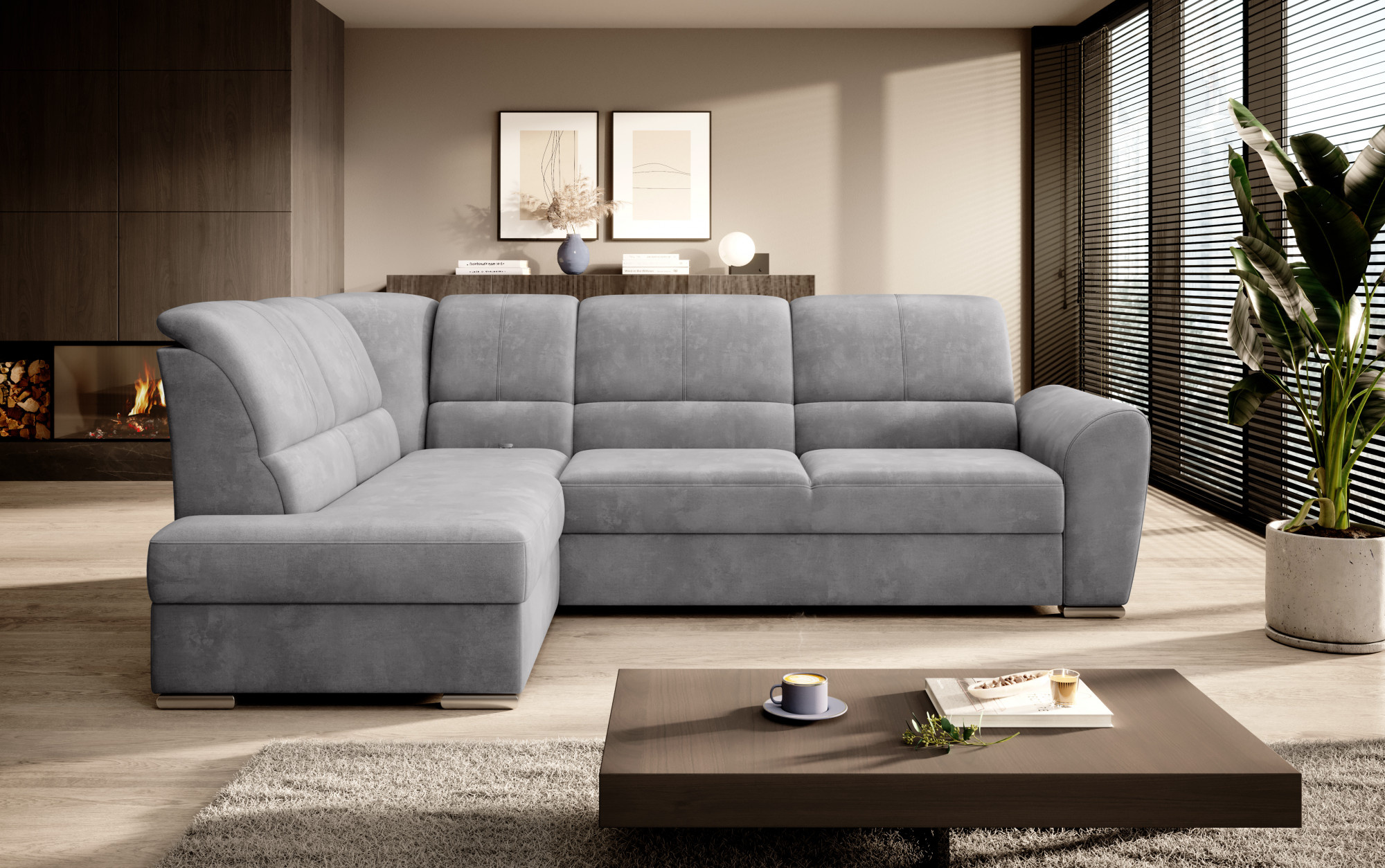 Rohová sedací souprava Siber je ideálním řešením pro ty, kteří si cení pořádku a organizace. Pomáhá šetřit místo díky velkému úložnému prostoru na lůžkoviny. Jeho vysoce profilované nastavitelné opěrky zad, zdobené stylovým prošíváním, zajistí, že i hodiny relaxace u vašeho oblíbeného televizního seriálu budou pohodlným a komfortním zážitkem. Rozměry rohové sedací soupravy: 270 x 186 x 93 cm, což umožňuje klidný odpočinek pro větší počet lidí bez nutnosti přidávat další sedací nábytek. Kromě toho se rohová sedačka může stát dalším lůžkem díky skládací funkci spaní s plochou 205 x 125 cm. Mechanismus skládání typu delfín použitý v tomto kusu nábytku je skvělý a jednoduchý způsob, jak proměnit rohovou pohovku na plnohodnotnou postel. Za zmínku stojí také nastavitelné opěrky zad, které vám mohou pomoci pohodlně relaxovat při čtení knihy nebo sledování televize. Zajímavými prvky tohoto kusu nábytku jsou jeho 5 cm vysoké dřevěné nohy a také sedák vyplněný pěnou T30, která poskytuje vynikající pružnost a vysokou hustotu.