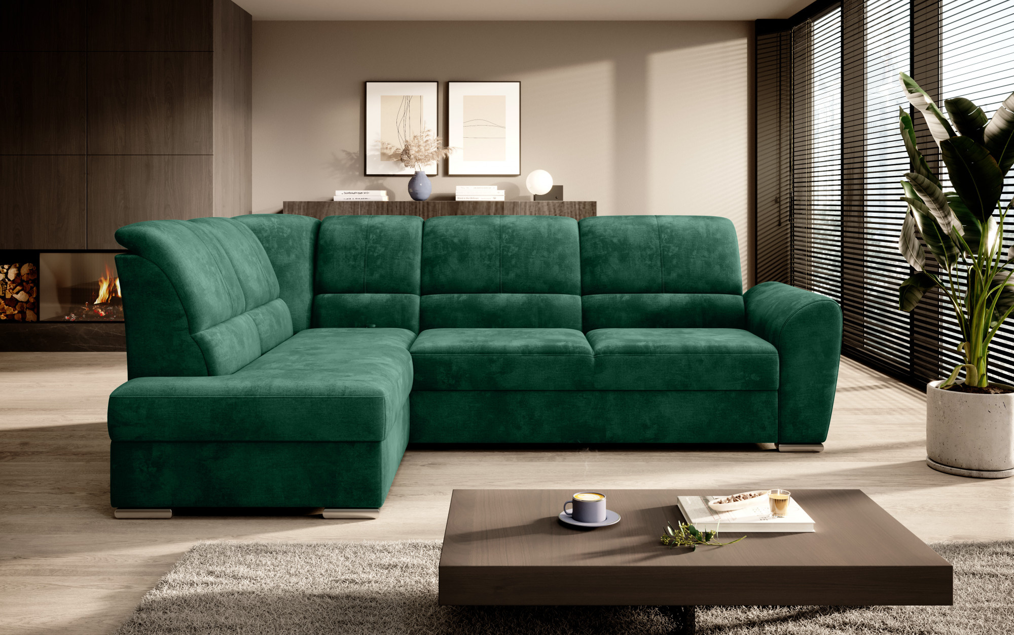 Rohová sedací souprava Siber je ideálním řešením pro ty, kteří si cení pořádku a organizace. Pomáhá šetřit místo díky velkému úložnému prostoru na lůžkoviny. Jeho vysoce profilované nastavitelné opěrky zad, zdobené stylovým prošíváním, zajistí, že i hodiny relaxace u vašeho oblíbeného televizního seriálu budou pohodlným a komfortním zážitkem. Rozměry rohové sedací soupravy: 270 x 186 x 93 cm, což umožňuje klidný odpočinek pro větší počet lidí bez nutnosti přidávat další sedací nábytek. Kromě toho se rohová sedačka může stát dalším lůžkem díky skládací funkci spaní s plochou 205 x 125 cm. Mechanismus skládání typu delfín použitý v tomto kusu nábytku je skvělý a jednoduchý způsob, jak proměnit rohovou pohovku na plnohodnotnou postel. Za zmínku stojí také nastavitelné opěrky zad, které vám mohou pomoci pohodlně relaxovat při čtení knihy nebo sledování televize. Zajímavými prvky tohoto kusu nábytku jsou jeho 5 cm vysoké dřevěné nohy a také sedák vyplněný pěnou T30, která poskytuje vynikající pružnost a vysokou hustotu.