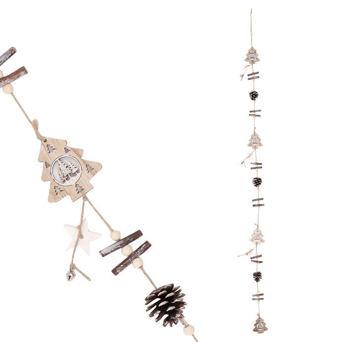 Vyzdobte si svůj interiér a proměňte ho v prostor, který bude dokonale odrážet kouzlo a výjimečnost vánočních svátků. V jednoduchosti je krása, a právě tato závěsná ozdoba na provázku, je skvělým příkladem. Je ve formě girlandy sestavené z pravidelně se střídajících dřevěných stromečků a borovicových šišek propojených provázkem. Vaše domácí prostředí se stane malebnějším a útulnějším, ve kterém se budete cítit jako v pohádce.