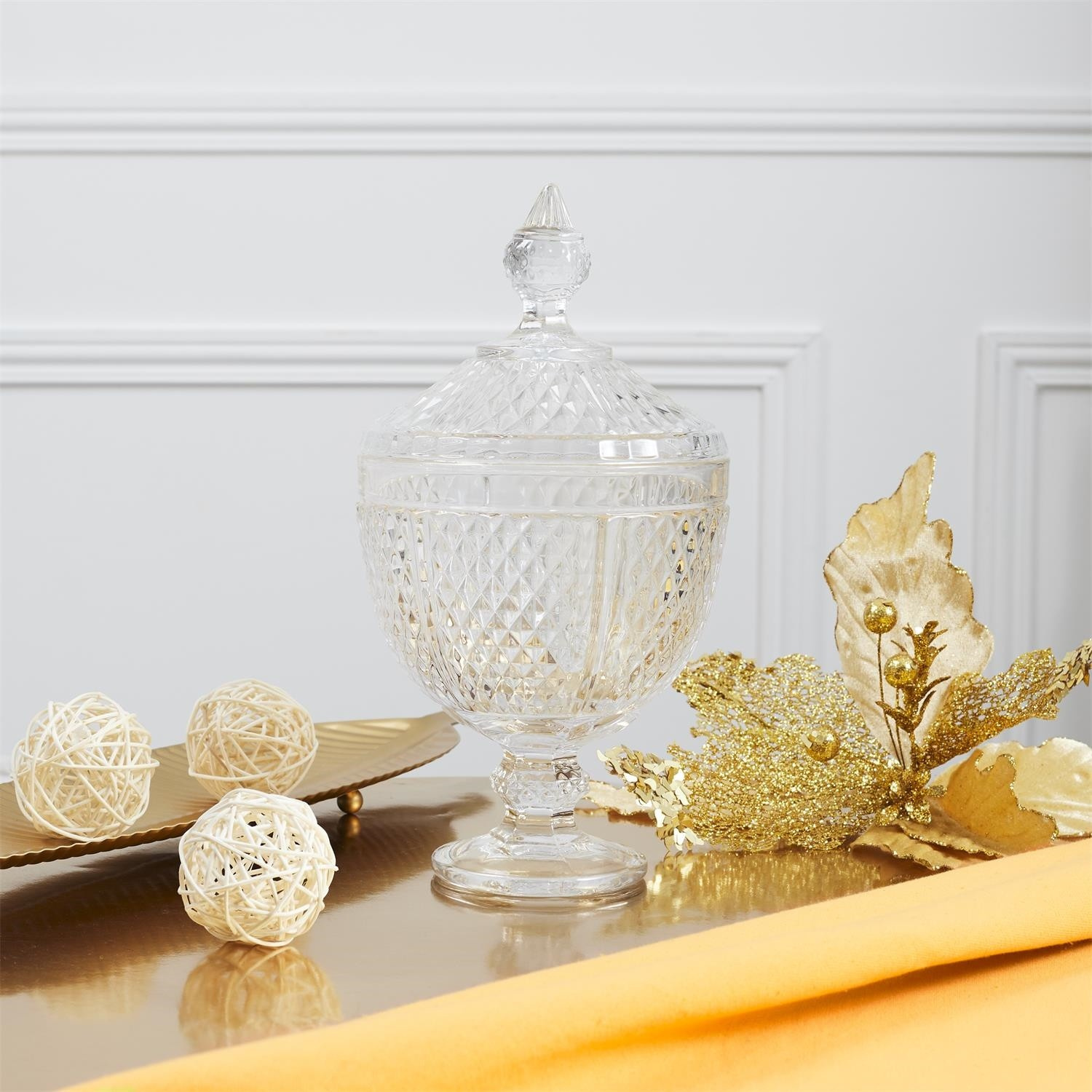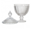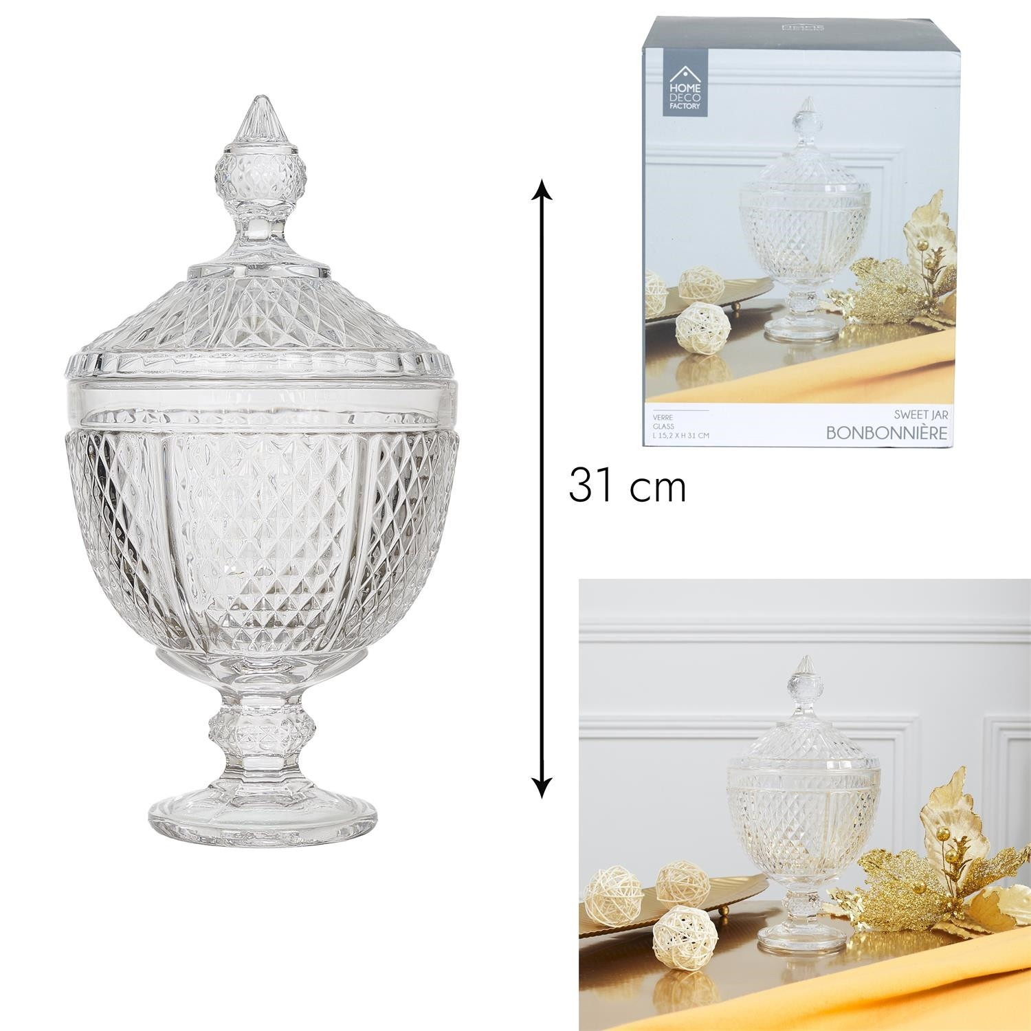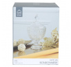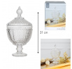 Skleněná bonboniéra je elegantní prvek interiéru, ale také poslouží jako nádoba na skladování. Bonboniéra vyrobená ze skla je bohatě zdobená. Vybavená víkem zaručuje bezpečné uchovávání pochoutek. Bonboniéra zaručuje mnoho možností jejího využití. Bonboniéra je vhodná k uchovávání potravin. Nelze mýt v myčce nádobí Nelze používat v mikrovlnné troubě