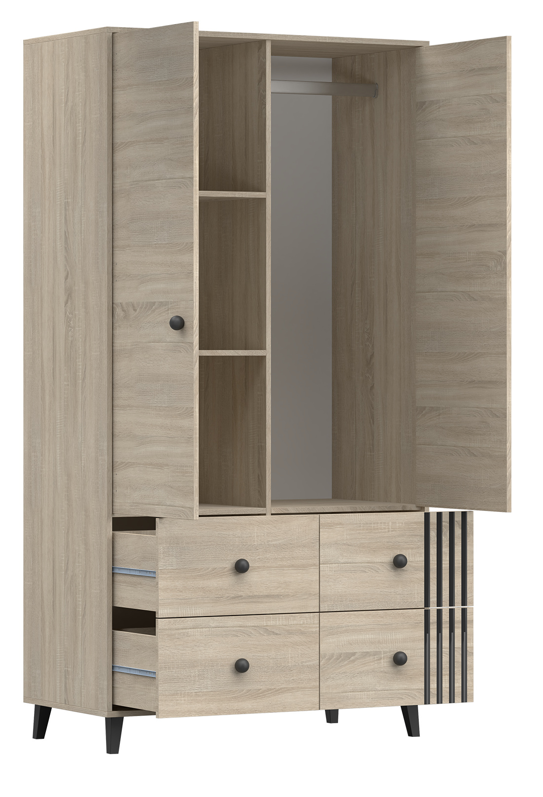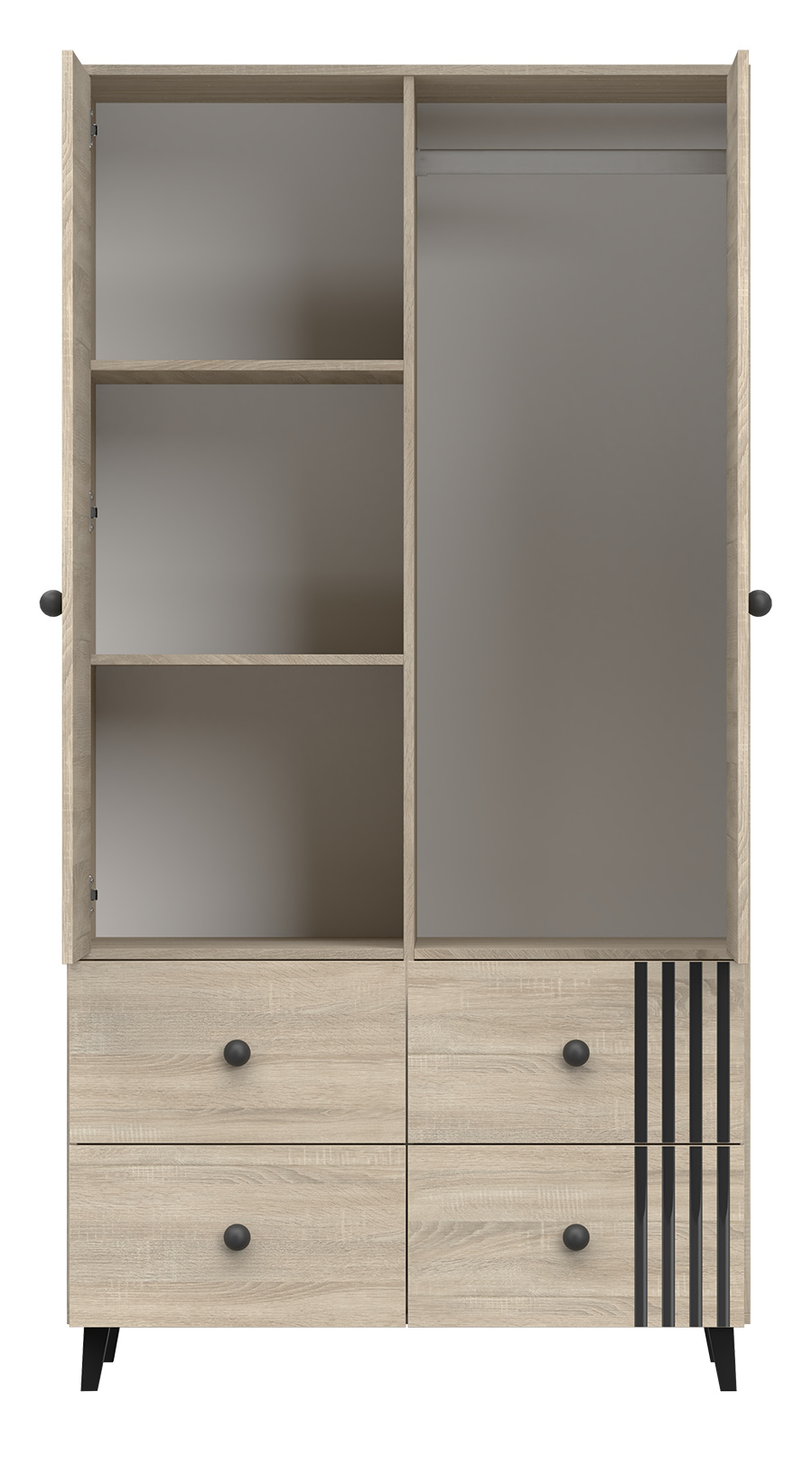 Nábytek FOX kombinuje moderní skandinávský styl s funkčností a každodenním pohodlím. Minimalistické černé kovové úchytky, mírně lesklé šambrány mohou interiéru dodat eleganci a modernost. Jejich jednoduchost vytváří sofistikovaný efekt, který umocňuje charakter interiéru a dodává mu industriální a moderní styl.
