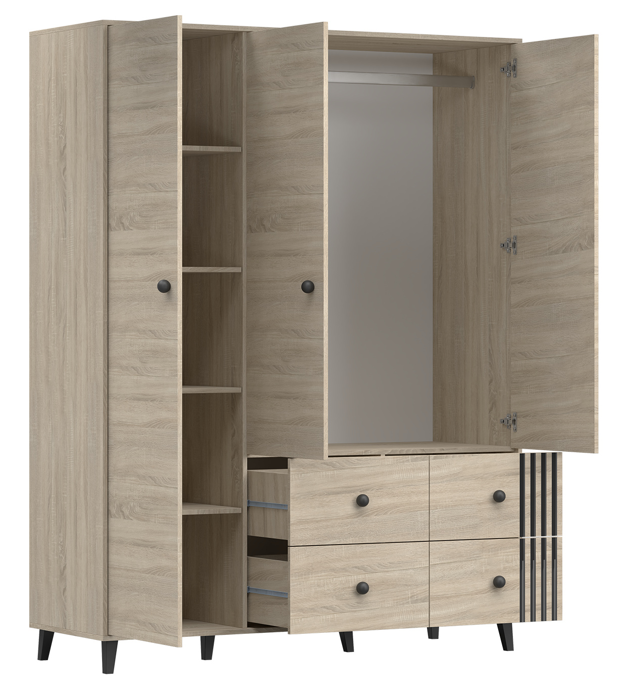 Nábytek FOX kombinuje moderní skandinávský styl s funkčností a každodenním pohodlím. Minimalistické černé kovové úchytky, mírně lesklé šambrány mohou interiéru dodat eleganci a modernost. Jejich jednoduchost vytváří sofistikovaný efekt, který umocňuje charakter interiéru a dodává mu industriální a moderní styl.