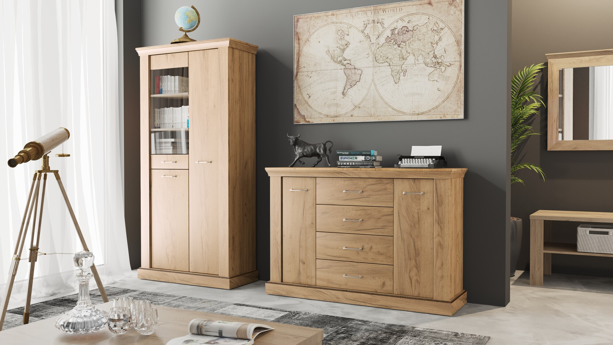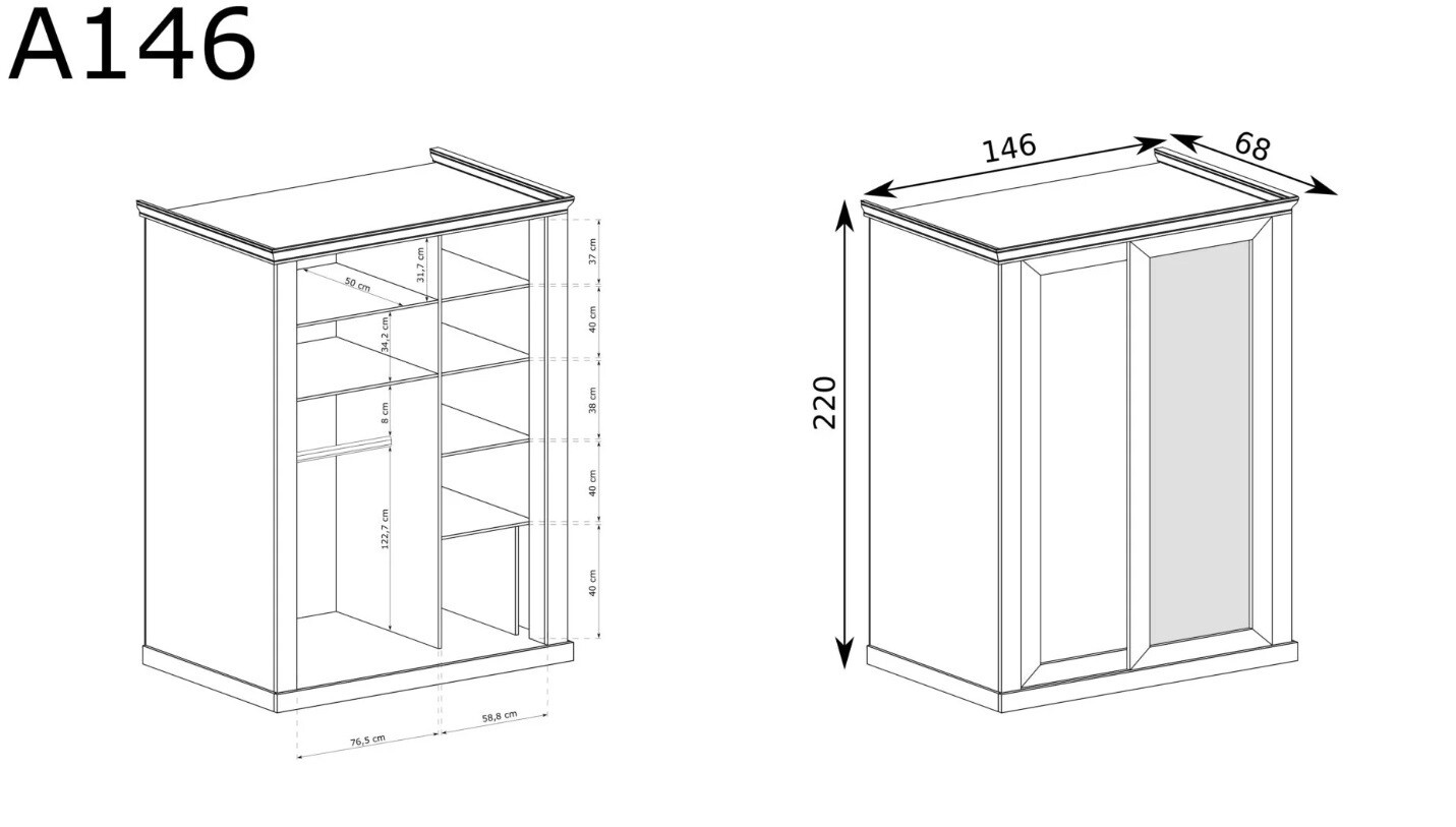 Prostorná šatní skříň z kolekce Antica, která má dvoje posuvné dveře, z nichž jedny mají zrcadlo. Má dvě zásuvky a pět polic. Má také vlastní část s tyčí, která umožňuje zavěsit oblečení, stejně jako využít zbývající prostor skříně. Nábytek je vhodný do ložnice, předsíně nebo obývacího pokoje. Lze s ním vytvořit mnoho sestav. Tato šatní skříň osloví příznivce klasického vzhledu a nevtíravé elegance. K dostání ve dvou barevných provedeních.