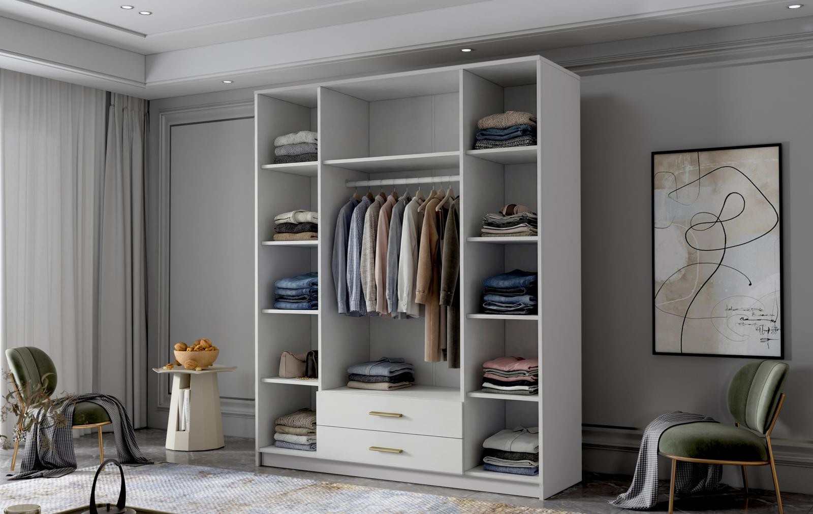 Šatní skříň Arya I v moderním designu má šířku 160 cm a je rozdělena na tři praktické části. Vnitřní uspořádání kombinuje závěsnou tyč, devět polic a 2 šuplíky, což umožňuje přehledné a praktické rozdělení šatníku.