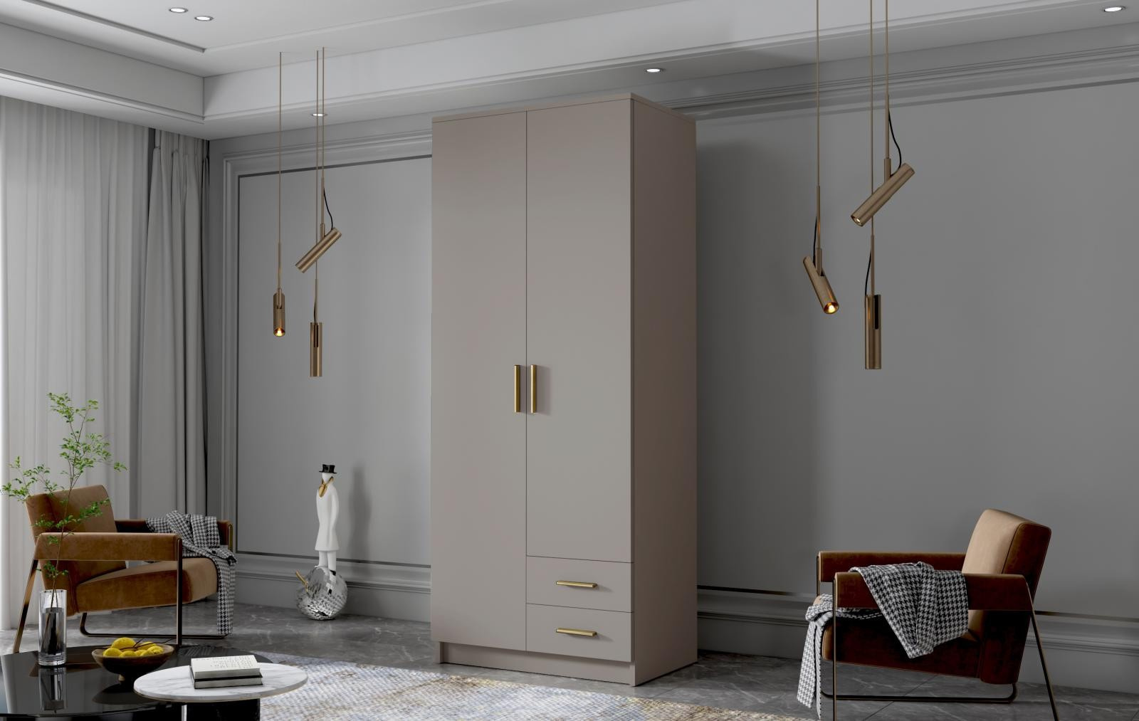 Šatní skříň Arya I v moderním designu má šířku 80 cm a je rozdělena na dvě praktické části. Vnitřní uspořádání kombinuje závěsnou tyč, čtyři police a 2 šuplíky, což umožňuje přehledné a praktické rozdělení šatníku.