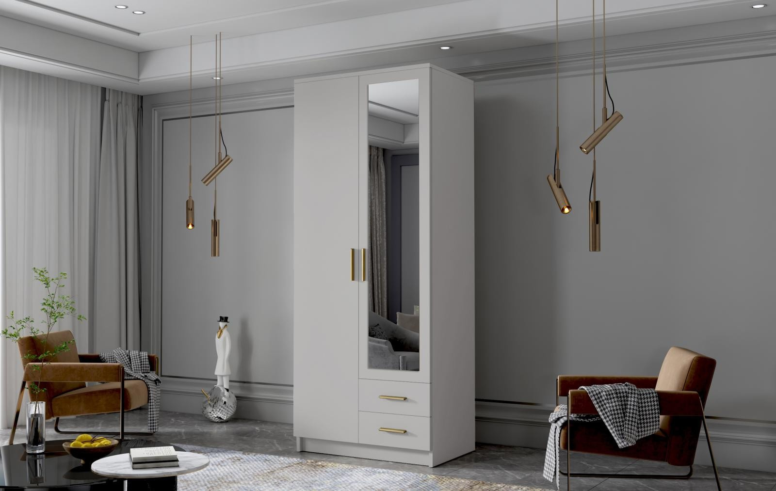 Šatní skříň Arya II v moderním designu má šířku 80 cm a je rozdělena na dvě praktické části. Vnitřní uspořádání kombinuje závěsnou tyč, čtyři police a 2 šuplíky, což umožňuje přehledné a praktické rozdělení šatníku.