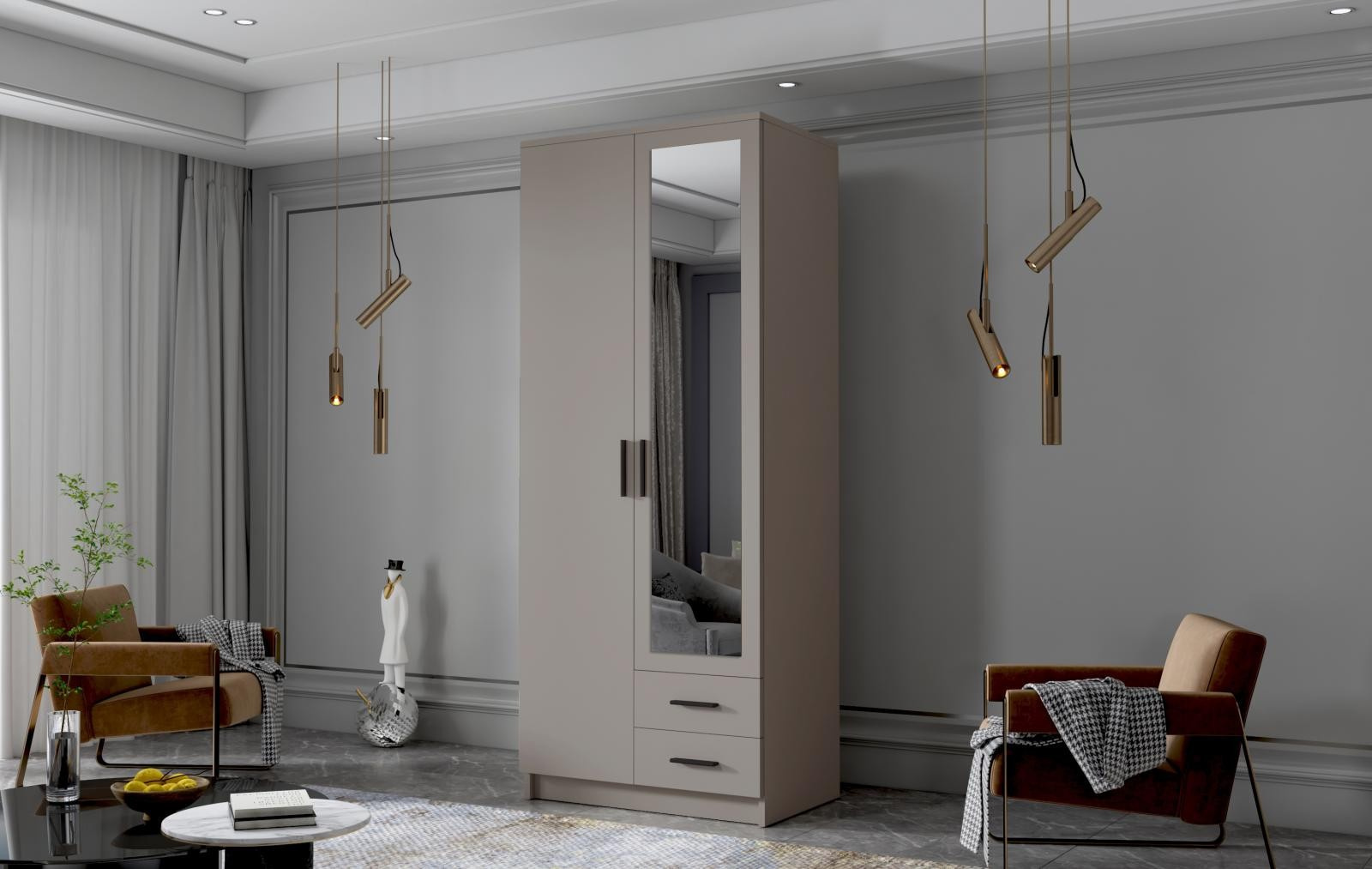 Šatní skříň Arya II v moderním designu má šířku 80 cm a je rozdělena na dvě praktické části. Vnitřní uspořádání kombinuje závěsnou tyč, čtyři police a 2 šuplíky, což umožňuje přehledné a praktické rozdělení šatníku.