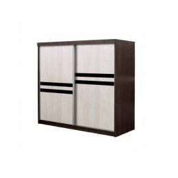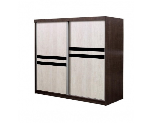 Moderní a praktická skříň s posuvnými dveřmi, která je v jedné části policová a v druhé části je šatní tyč. Celá skříň včetně korpusu je v provedení dub sonoma v kombinací s černými skleněnými pruhy. Rozměry: výška 200cm x šířka 150cm x hloubka 60cm