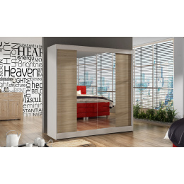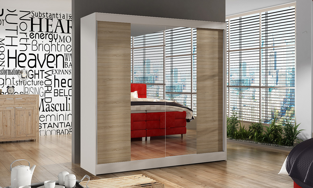 Skříň je vyrobena z kvalitního lamina. Díky svému vnitřnímu uspořádání nabízí dostatek úložného prostoru, posuvné dveře šetří prostor a zrcadlo ho opticky zvětšuje. Skříň je vhodná do ložnice, dětského nebo studentského pokoje, do předsíně i kanceláře. Vnitřní uspořádání skříně je vyobrazeno na fotografii. Skříň je dodávána v demontu. Součástí jsou i skleněná zrcadla, která jsou nalepena na dveřích skříně a také montážní plánek včetně všech potřebných spojovacích materiálů. Vyobrazené dekorace nejsou v ceně.