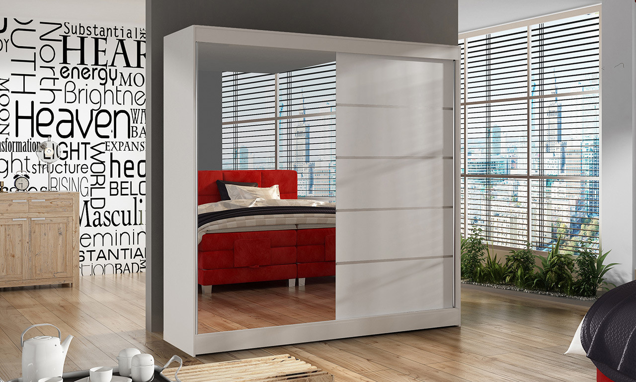 Skříň je vyrobena z kvalitního lamina. Díky svému vnitřnímu uspořádání nabízí dostatek úložného prostoru, posuvné dveře šetří prostor a zrcadlo ho opticky zvětšuje. Skříň je vhodná do ložnice, dětského nebo studentského pokoje, do předsíně i kanceláře. Vnitřní uspořádání skříně je vyobrazeno na fotografii. Skříň je dodávána v demontu. Součástí je i skleněné zrcadlo, které je nalepeno na jedné části dveří skříně a také montážní plánek včetně všech potřebných spojovacích materiálů. Vyobrazené dekorace nejsou v ceně.