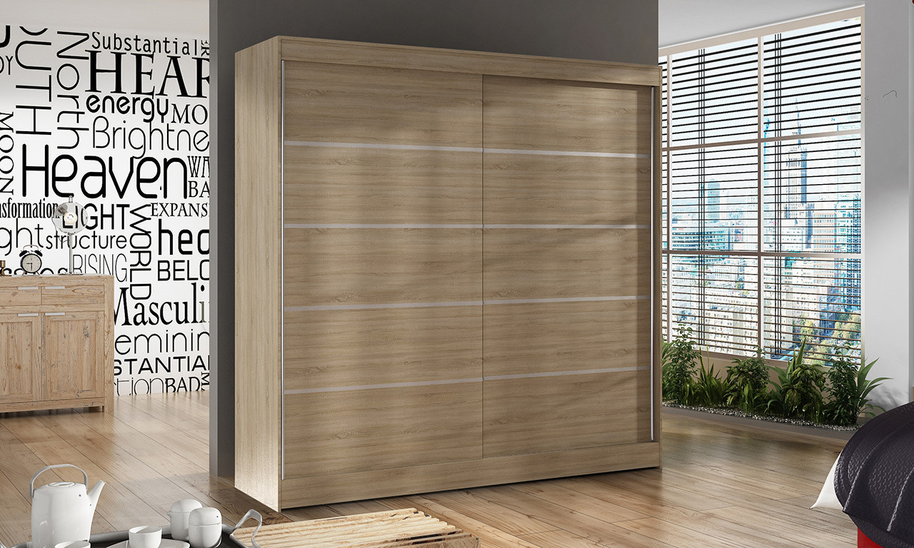 Skříň je vyrobena z kvalitního lamina. Díky svému vnitřnímu uspořádání nabízí dostatek úložného prostoru a posuvné dveře prostor šetří. Skříň je vhodná do ložnice, dětského nebo studentského pokoje, do předsíně i kanceláře. Vnitřní uspořádání skříně je vyobrazeno na fotografii. Skříň je dodávána v demontu a součástí je montážní plánek včetně všech potřebných spojovacích materiálů. Vyobrazené dekorace nejsou v ceně.