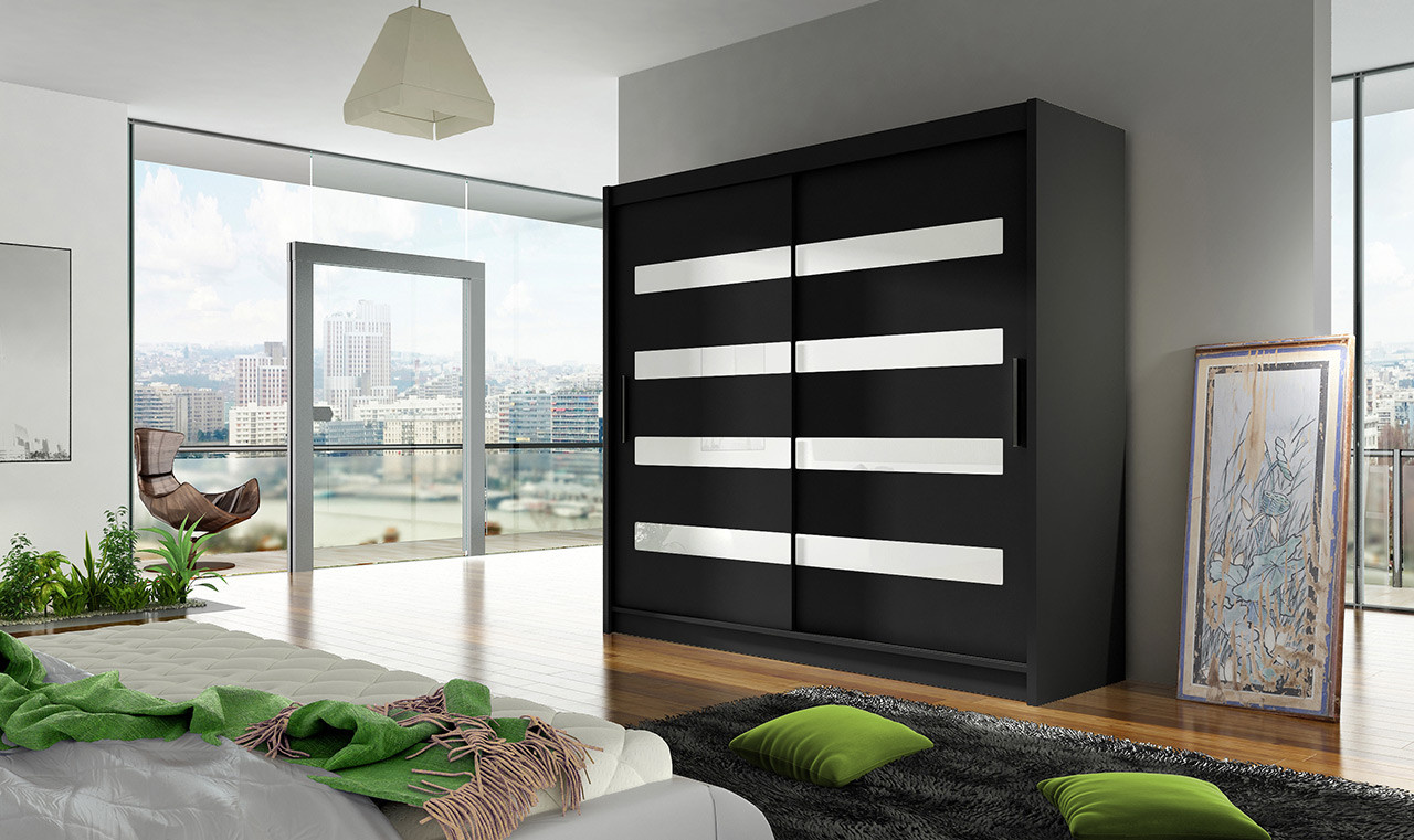 Skříň Berger s posuvnými dveřmi, je vyrobena z kvalitního lamina o síle 16 mm a hrany jsou ukončeny ABS lištou. Vodící lišty jsou vyrobeny z odolného hliníku a splňují požadavky pro každodenní užívání. Skříň je doplněna bílými pruhy v lesku, které jí dodávají elegantní vzhled . Skříň díky svým rozměrům a uspořádání poskytuje dostatek úložného prostoru. Je dodávána v demontu a součástí je montážní plánek včetně všech potřebných spojovacích materiálů. Vyobrazené dekorace nejsou v ceně.