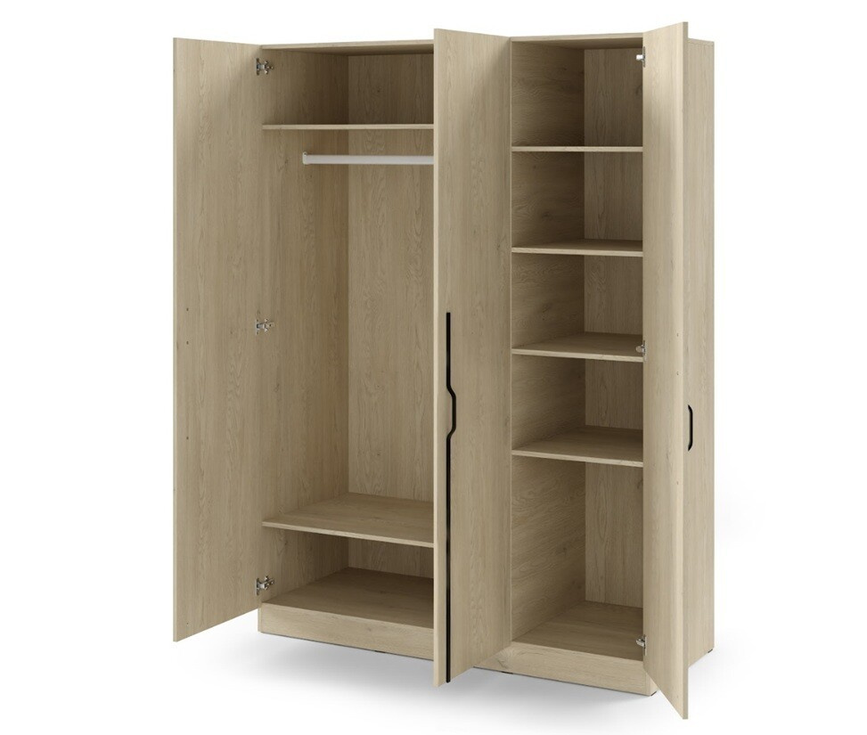 Tato 3-dveřová skříň nabízí dostatek prostoru pro všechny vaše potřeby. S šířkou 150 cm, výškou 210 cm a hloubkou 60,5 cm poskytuje skříň BRAGA 2 dostatek místa pro uložení oblečení, ložního prádla a dalších osobních věcí. Absence zrcadla na dveřích umožňuje plné využití vnitřního prostoru pro úložné účely.