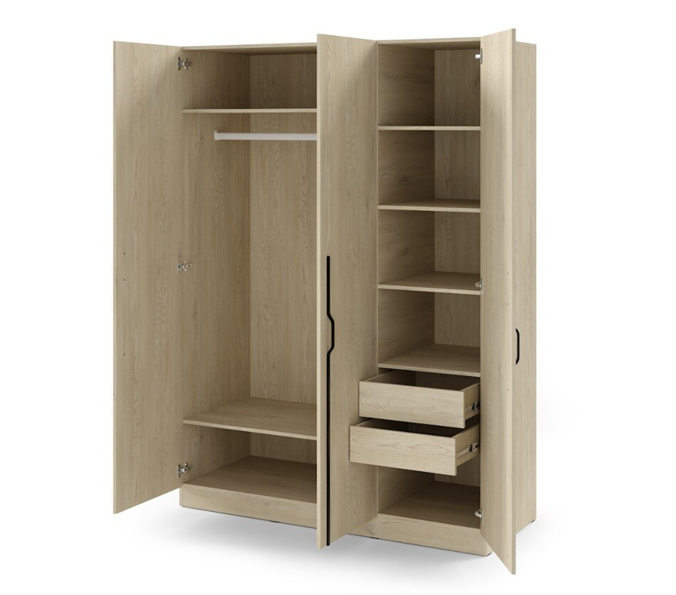Tato 3-dveřová skříň nabízí dostatek prostoru pro všechny vaše potřeby. S šířkou 150 cm, výškou 210 cm a hloubkou 60,5 cm poskytuje skříň BRAGA 2 dostatek místa pro uložení oblečení, ložního prádla a dalších osobních věcí. Absence zrcadla na dveřích umožňuje plné využití vnitřního prostoru pro úložné účely.