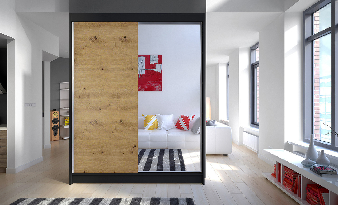 Skříň je vyrobena z kvalitního lamina. Díky svému vnitřnímu uspořádání nabízí dostatek úložného prostoru, posuvné dveře šetří prostor a zrcadlo ho opticky zvětšuje. Skříň je vhodná do ložnice, dětského nebo studentského pokoje, do předsíně i kanceláře. Vnitřní uspořádání skříně je vyobrazeno na fotografii. Skříň je dodávána v demontu. Součástí je i skleněné zrcadlo, které je nalepeno na jedné části dveří skříně a také montážní plánek včetně všech potřebných spojovacích materiálů. Vyobrazené dekorace nejsou v ceně.