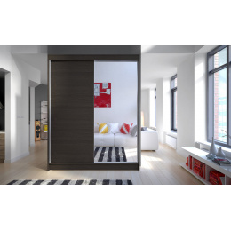 Skříň je vyrobena z kvalitního lamina. Díky svému vnitřnímu uspořádání nabízí dostatek úložného prostoru, posuvné dveře šetří prostor a zrcadlo ho opticky zvětšuje. Skříň je vhodná do ložnice, dětského nebo studentského pokoje, do předsíně i kanceláře. Vnitřní uspořádání skříně je vyobrazeno na fotografii. Skříň je dodávána v demontu. Součástí je i skleněné zrcadlo, které je nalepeno na jedné části dveří skříně a také montážní plánek včetně všech potřebných spojovacích materiálů. Vyobrazené dekorace nejsou v ceně.