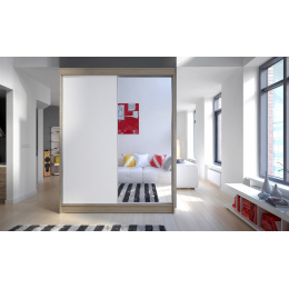 Skříň je vyrobena z kvalitního lamina. Díky svému vnitřnímu uspořádání nabízí dostatek úložného prostoru, posuvné dveře šetří prostor a zrcadlo ho opticky zvětšuje. Skříň je vhodná do ložnice, dětského nebo studentského pokoje, do předsíně i kanceláře. Vnitřní uspořádání skříně je vyobrazeno na fotografii. Skříň je dodávána v demontu. Součástí je i skleněné zrcadlo, které je nalepeno na jedné části dveří skříně a také montážní plánek včetně všech potřebných spojovacích materiálů. Vyobrazené dekorace nejsou v ceně.