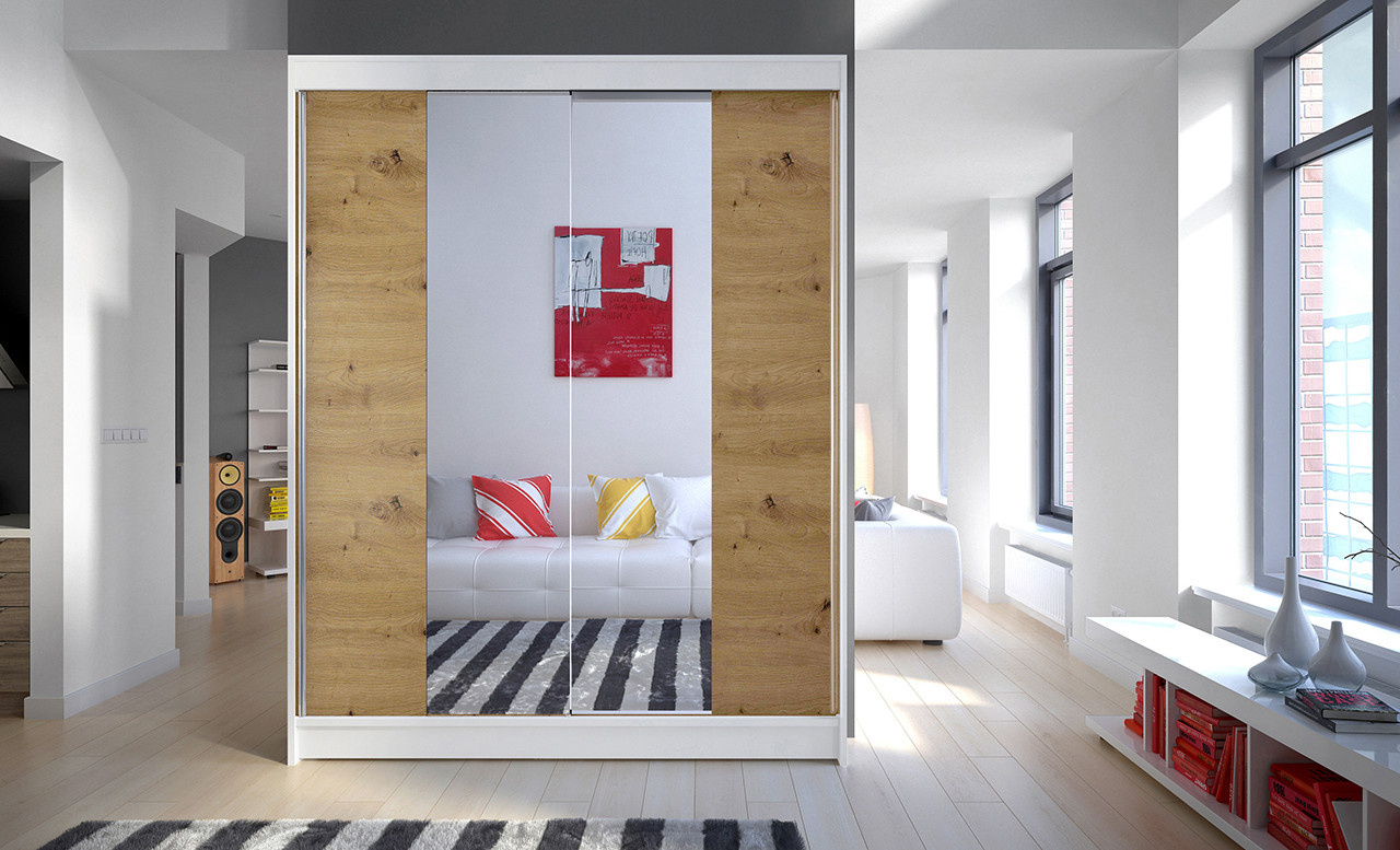 Skříň je vyrobena z kvalitního lamina. Díky svému vnitřnímu uspořádání nabízí dostatek úložného prostoru, posuvné dveře šetří prostor a zrcadlo ho opticky zvětšuje. Skříň je vhodná do ložnice, dětského nebo studentského pokoje, do předsíně i kanceláře. Vnitřní uspořádání skříně je vyobrazeno na fotografii. Skříň je dodávána v demontu. Součástí jsou i skleněná zrcadla, která jsou nalepena na dveřích skříně a také montážní plánek včetně všech potřebných spojovacích materiálů. Vyobrazené dekorace nejsou v ceně.