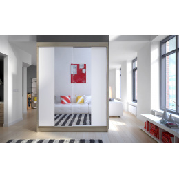 Skříň je vyrobena z kvalitního lamina. Díky svému vnitřnímu uspořádání nabízí dostatek úložného prostoru, posuvné dveře šetří prostor a zrcadlo ho opticky zvětšuje. Skříň je vhodná do ložnice, dětského nebo studentského pokoje, do předsíně i kanceláře. Vnitřní uspořádání skříně je vyobrazeno na fotografii. Skříň je dodávána v demontu. Součástí jsou i skleněná zrcadla, která jsou nalepena na dveřích skříně a také montážní plánek včetně všech potřebných spojovacích materiálů. Vyobrazené dekorace nejsou v ceně.