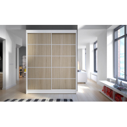 Skříň je vyrobena z kvalitního lamina. Díky svému vnitřnímu uspořádání nabízí dostatek úložného prostoru a posuvné dveře prostor šetří. Skříň je vhodná do ložnice, dětského nebo studentského pokoje, do předsíně i kanceláře. Vnitřní uspořádání skříně je vyobrazeno na fotografii. Skříň je dodávána v demontu a součástí je montážní plánek včetně všech potřebných spojovacích materiálů. Vyobrazené dekorace nejsou v ceně.