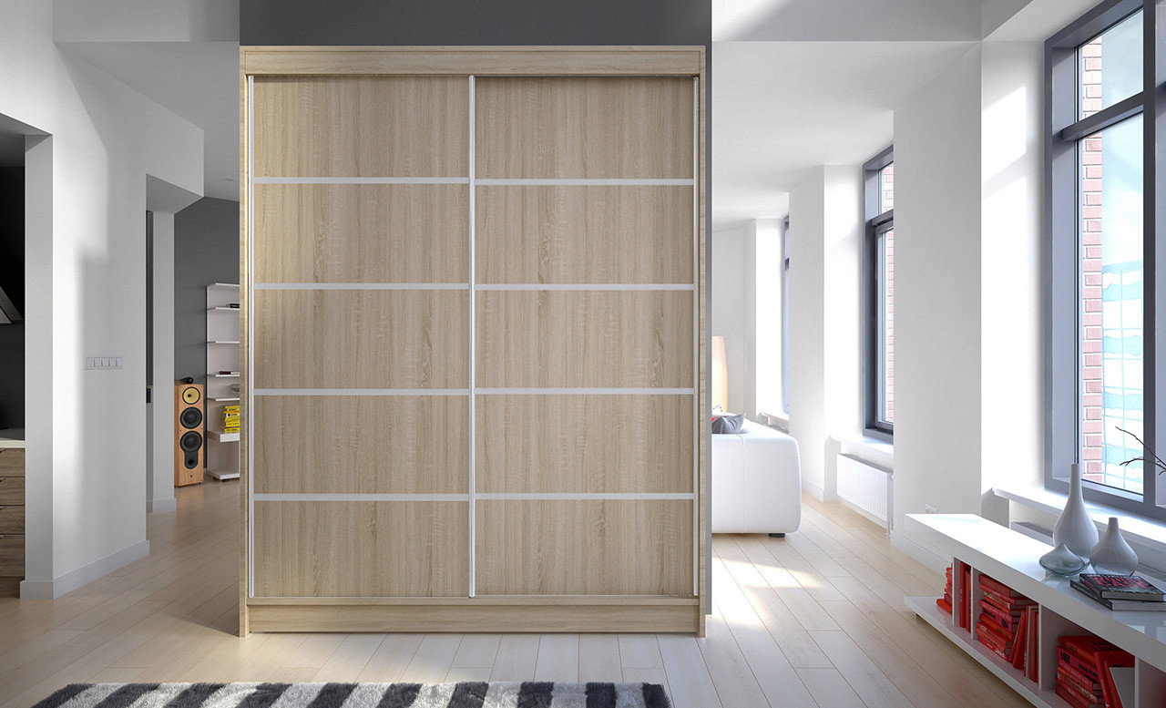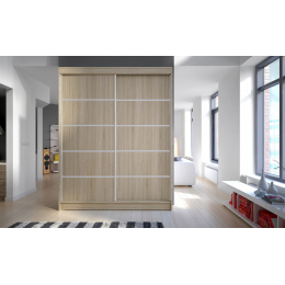Skříň je vyrobena z kvalitního lamina. Díky svému vnitřnímu uspořádání nabízí dostatek úložného prostoru a posuvné dveře prostor šetří. Skříň je vhodná do ložnice, dětského nebo studentského pokoje, do předsíně i kanceláře. Vnitřní uspořádání skříně je vyobrazeno na fotografii. Skříň je dodávána v demontu a součástí je montážní plánek včetně všech potřebných spojovacích materiálů. Vyobrazené dekorace nejsou v ceně.