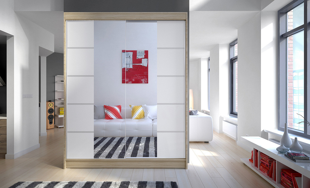 Skříň je vyrobena z kvalitního lamina. Díky svému vnitřnímu uspořádání nabízí dostatek úložného prostoru, posuvné dveře šetří prostor a zrcadlo ho opticky zvětšuje. Skříň je vhodná do ložnice, dětského nebo studentského pokoje, do předsíně i kanceláře. Vnitřní uspořádání skříně je vyobrazeno na fotografii. Skříň je dodávána v demontu. Součástí jsou i skleněná zrcadla, která jsou nalepena na dveřích skříně a také montážní plánek včetně všech potřebných spojovacích materiálů. Vyobrazené dekorace nejsou v ceně.