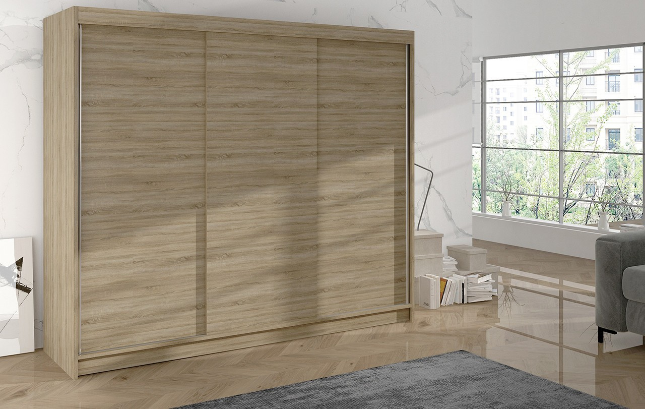 Korpus i dveře jsou vyrobeny z odolné 16 mm laminované desky s ABS hranami, které zajišťují dlouhou životnost. Posuvné dveře se hladce pohybují po hliníkových vodicích lištách. Skříň je dostupná v několika atraktivních barevných provedeních, takže ji snadno sladíte s ostatním nábytkem.