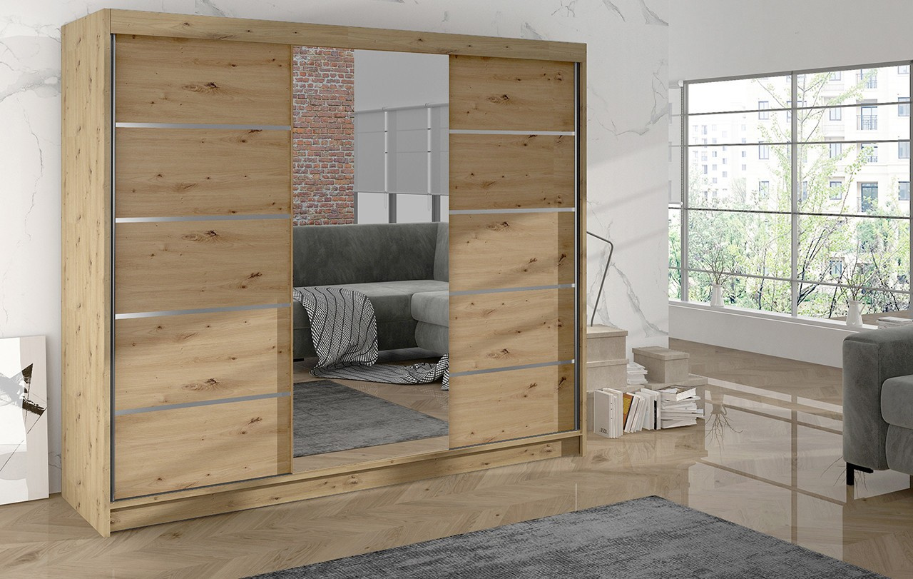 Korpus i dveře jsou vyrobeny z odolné 16 mm laminované desky s ABS hranami, které zajišťují dlouhou životnost. Posuvné dveře se hladce pohybují po hliníkových vodicích lištách. Skříň je dostupná v několika atraktivních barevných provedeních, takže ji snadno sladíte s ostatním nábytkem.