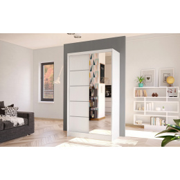 Šatní skříň Diem III v moderním designu má šířku 100 cm a je rozdělena na dvě praktické části. Posuvné dveře šetří místo a usnadňují přístup do interiéru. Vnitřní uspořádání kombinuje závěsnou tyč a čtyři police, což umožňuje přehledné a praktické rozdělení šatníku.