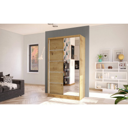 Šatní skříň Diem III v moderním designu má šířku 100 cm a je rozdělena na dvě praktické části. Posuvné dveře šetří místo a usnadňují přístup do interiéru. Vnitřní uspořádání kombinuje závěsnou tyč a čtyři police, což umožňuje přehledné a praktické rozdělení šatníku.
