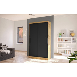 Šatní skříň Diem IV v moderním designu má šířku 100 cm a je rozdělena na dvě praktické části. Posuvné dveře šetří místo a usnadňují přístup do interiéru. Vnitřní uspořádání kombinuje závěsnou tyč a čtyři police, což umožňuje přehledné a praktické rozdělení šatníku.