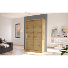 Šatní skříň Diem IV v moderním designu má šířku 100 cm a je rozdělena na dvě praktické části. Posuvné dveře šetří místo a usnadňují přístup do interiéru. Vnitřní uspořádání kombinuje závěsnou tyč a čtyři police, což umožňuje přehledné a praktické rozdělení šatníku.