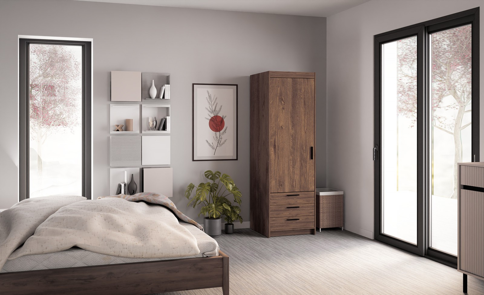 Šatní skříň Enja je vyrobena z kvalitního lamina tl.15 mm, které je odolné a snadné na údržbu. Vnitřní uspořádání skříně je praktické a poskytuje dostatek úložného prostoru. Své uplatnění najde v ložnici, předsíni i v dětském pokoji. Ke skříni lze dokoupit nádstavec. Skříň je dodávaná v demontu a nabízíme ji ve několika barevných provedeních. Součástí balení je montážní plánek včetně všech potřebných spojovacích materiálů.