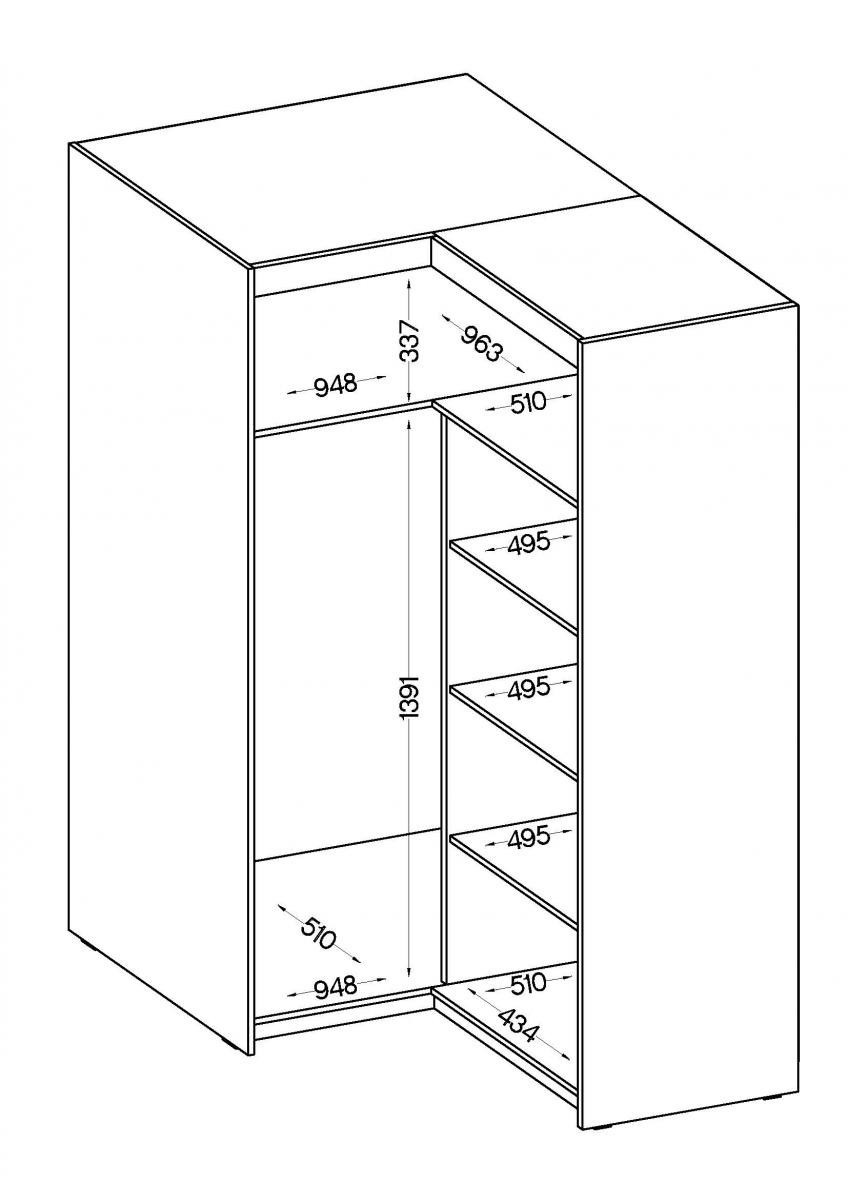 Rohová šatní skříň Enja je vyrobena z kvalitního lamina tl.15 mm, které je odolné a snadné na údržbu. Vnitřní uspořádání skříně je praktické a poskytuje dostatek úložného prostoru. Své uplatnění najde v ložnici, předsíni i v dětském pokoji. Ke skříni lze dokoupit nádstavec. Skříň je dodávaná v demontu a nabízíme ji ve několika barevných provedeních. Součástí balení je montážní plánek včetně všech potřebných spojovacích materiálů.