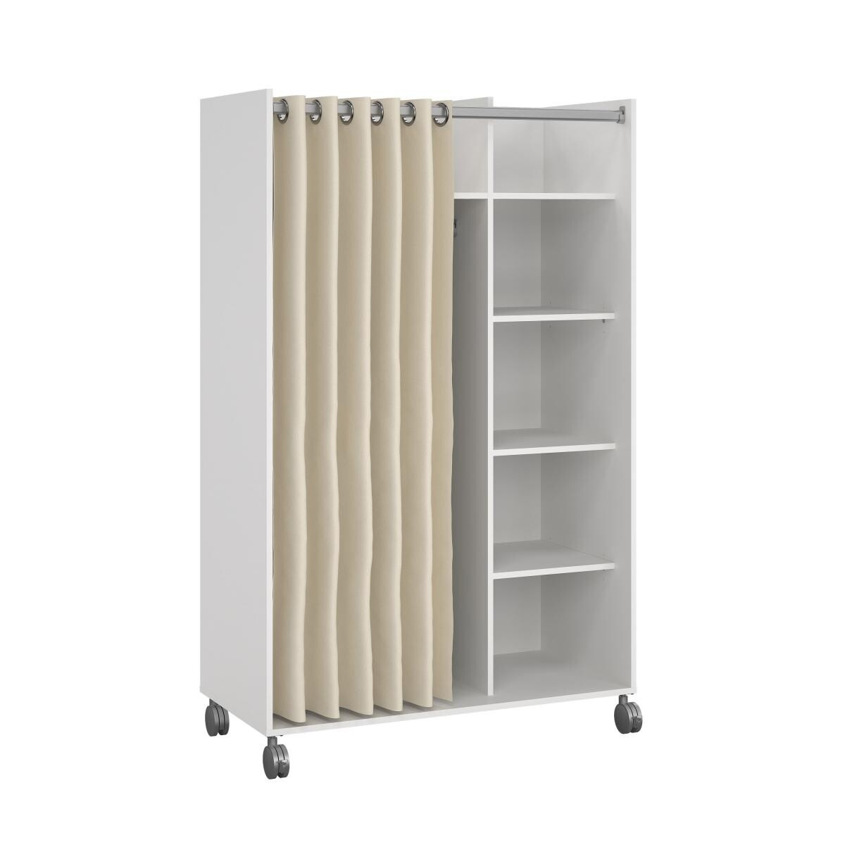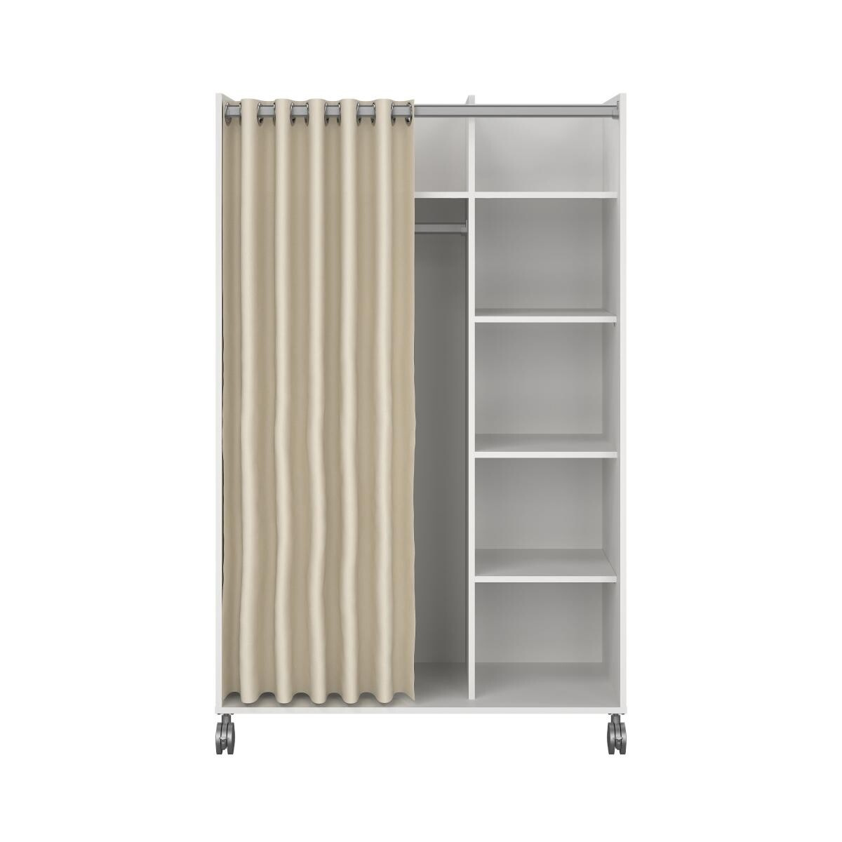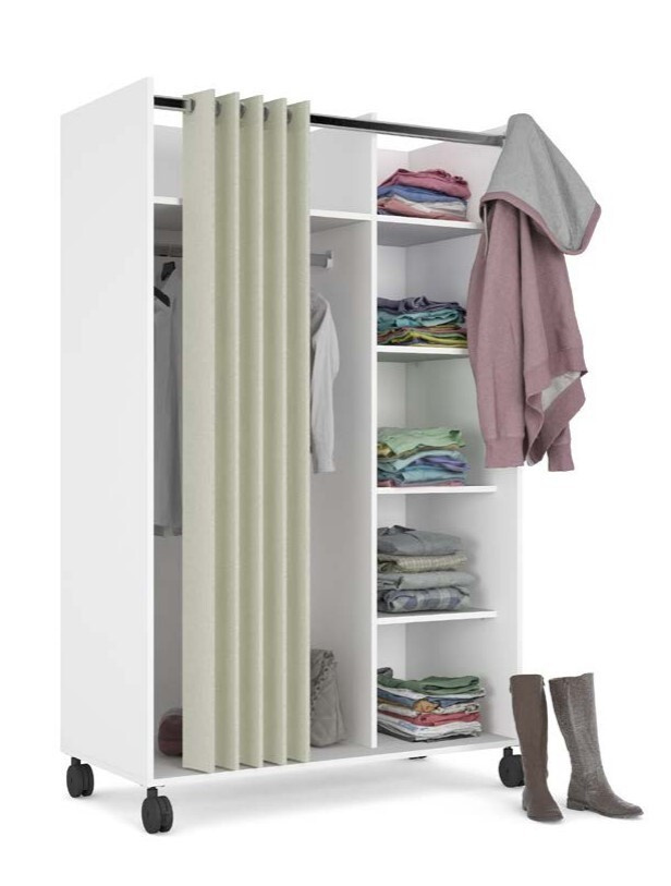 Mobilní šatní skříň na kolečkách Harmony má netypický a originální design. Skříň má dostatek úložného prostoru a univerzální využití. Je vyrobena z lamina a klasické dveře jsou nahrazeny závěsem v krémové barvě. Díky kolečkům skříň jednoduše přesunete kam budete potřebovat. Skvěle se hodí do studentských pokojů, kanceláří, pracoven dětských pokojů, nebo předsíní. Skříň je dodávaná v demontu. Součástí balení je montážní plánek včetně všech spojovacích prvků. Vyobrazené doplňky a dekorace nejsou v ceně.