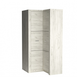 Rohová šatní skříň z kolekce Indianapolis. Nábytek je velmi prostorný, což vám poskytne možnost snadné organizace a správy prostoru. Levá strana má jednu polici a tyč, která umožňuje vyplnit prostor, který je pod tyčí. Pravá strana šatní skříně má čtyři police, které jsou ideální pro umístění oblečení, které lze složit. Šatní skříň dokonale zapadne do každého rohu a dodá místnosti teplo a šarm. K dispozici je možnost tří polic, které se přidají na levou stranu. Kovové úchytky podtrhují akcent nábytku. Možná je i obrácená varianta. K dostání ve třech barevných provedeních.