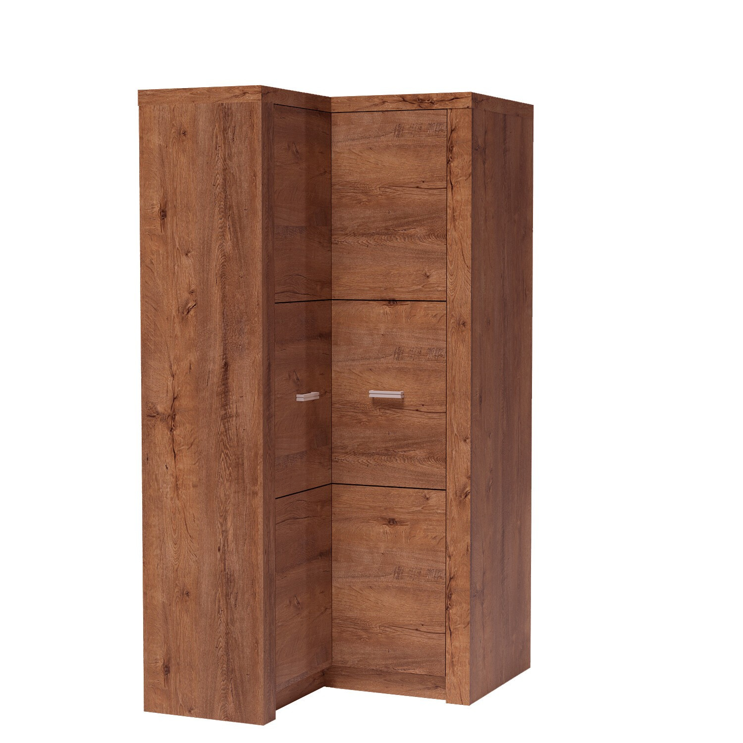 Rohová šatní skříň z kolekce Indianapolis. Nábytek je velmi prostorný, což vám poskytne možnost snadné organizace a správy prostoru. Levá strana má jednu polici a tyč, která umožňuje vyplnit prostor, který je pod tyčí. Pravá strana šatní skříně má čtyři police, které jsou ideální pro umístění oblečení, které lze složit. Šatní skříň dokonale zapadne do každého rohu a dodá místnosti teplo a šarm. K dispozici je možnost tří polic, které se přidají na levou stranu. Kovové úchytky podtrhují akcent nábytku. Možná je i obrácená varianta. K dostání ve třech barevných provedeních.