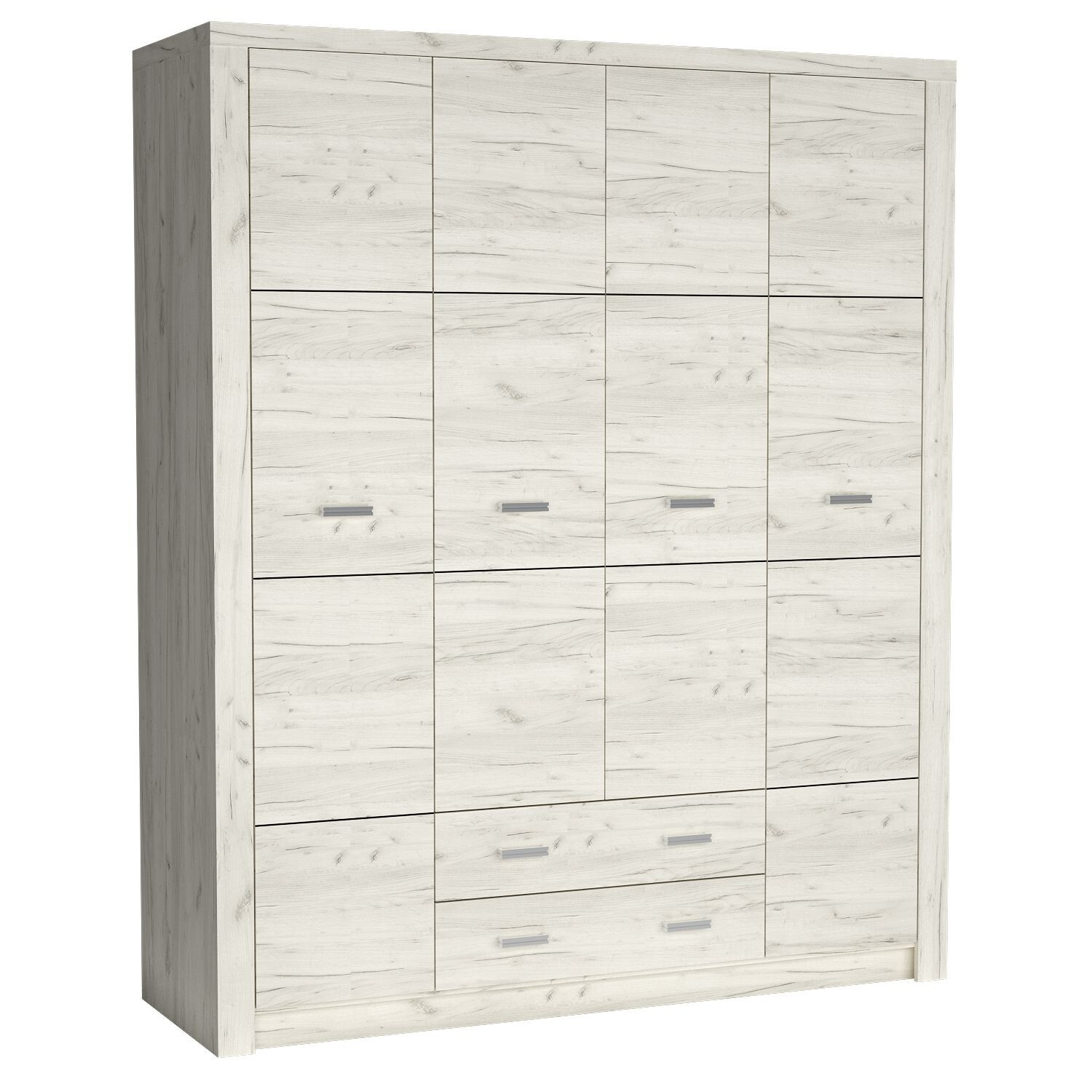 Velká čtyřdveřová šatní skříň se stříbrnými úchytkami, která vám umožní dobře využít prostor ve vaší domácnosti. Má pět polic, které umožňují uspořádat věci, které je třeba položit na rovnou plochu, a dvě prostorné zásuvky, díky nimž můžete do skříně uložit ještě více věcí. Součástí nábytku jsou také dvě tyče o délce 45,5 cm a jedna tyč o délce 77,6 cm, které vám umožní věšet věci na ramínka a udržovat pořádek v každém oděvu. Hodí se do každého typu místnosti a mnohé překvapí svou konstrukcí a stylem. K dostání ve třech barvách.