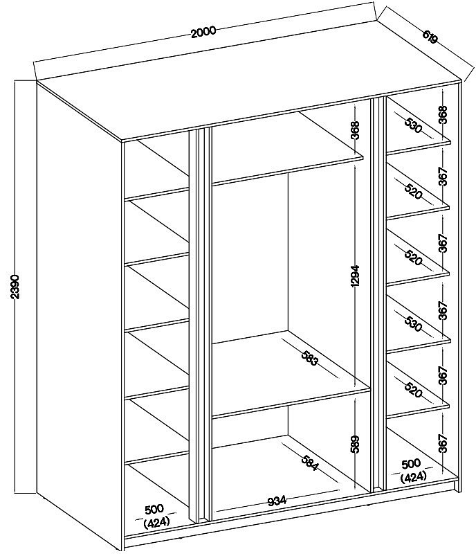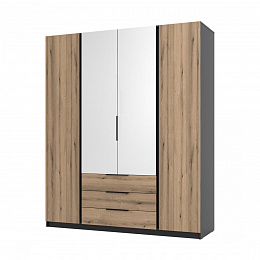 Šatní skříň Keny III v moderním designu má šířku 200 cm a je rozdělena na tři praktické části. Vnitřní uspořádání kombinuje závěsnou tyč, 11 polic a 3 šuplíky, což umožňuje přehledné a praktické rozdělení šatníku.
