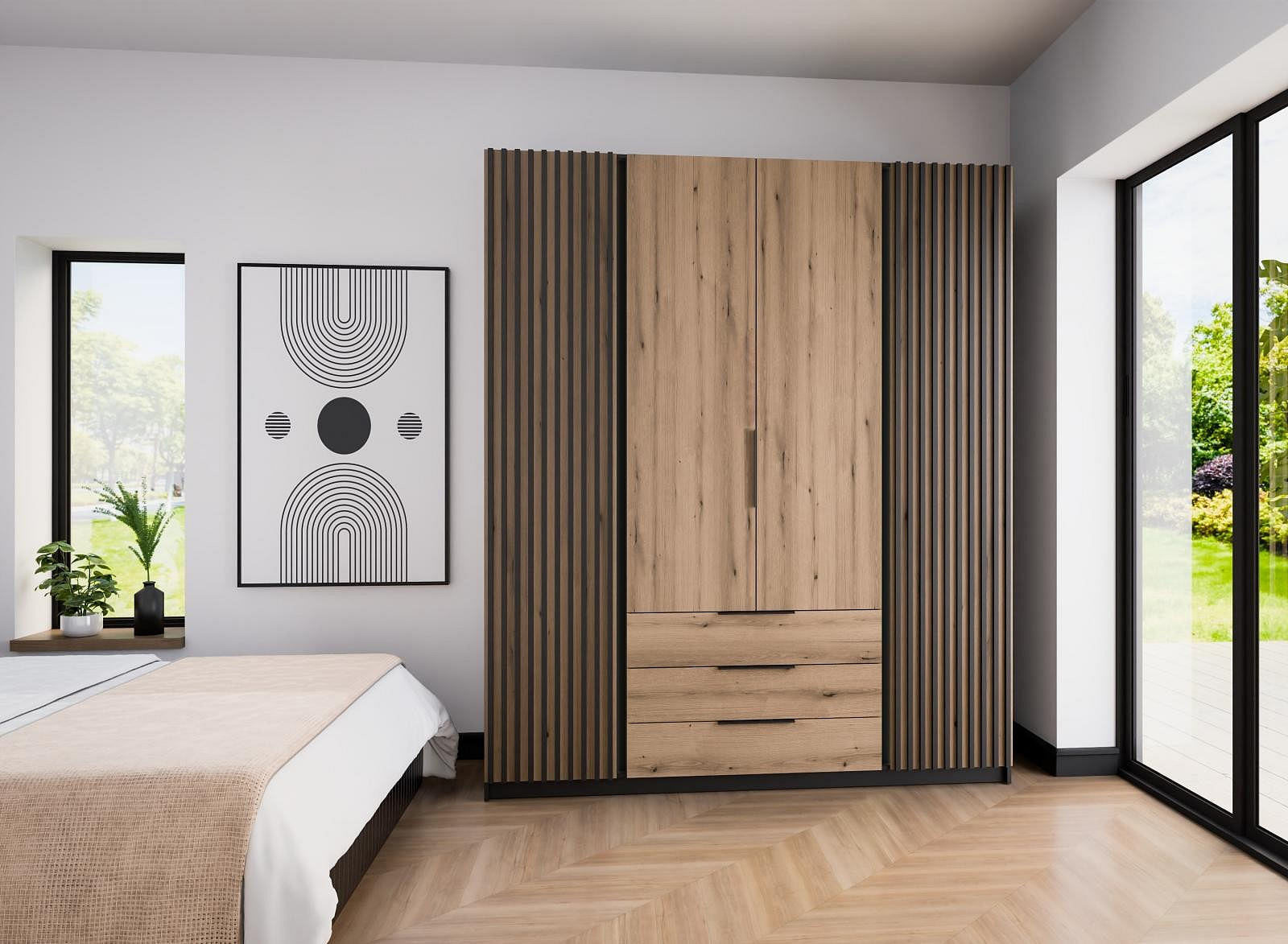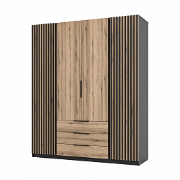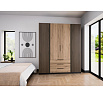 Šatní skříň Keny IV v moderním designu má šířku 200 cm a je rozdělena na tři praktické části. Vnitřní uspořádání kombinuje závěsnou tyč, 11 polic a 3 šuplíky, což umožňuje přehledné a praktické rozdělení šatníku.