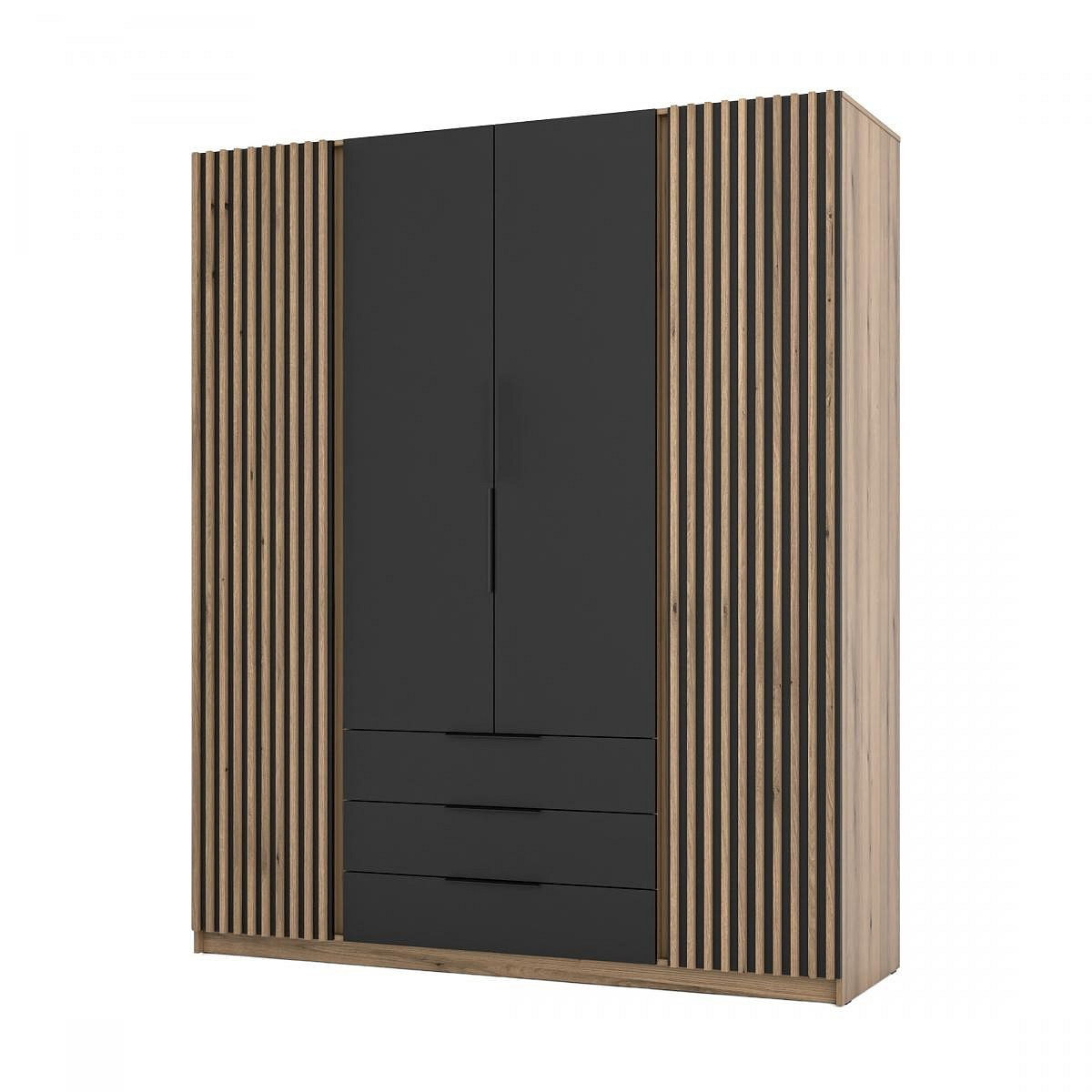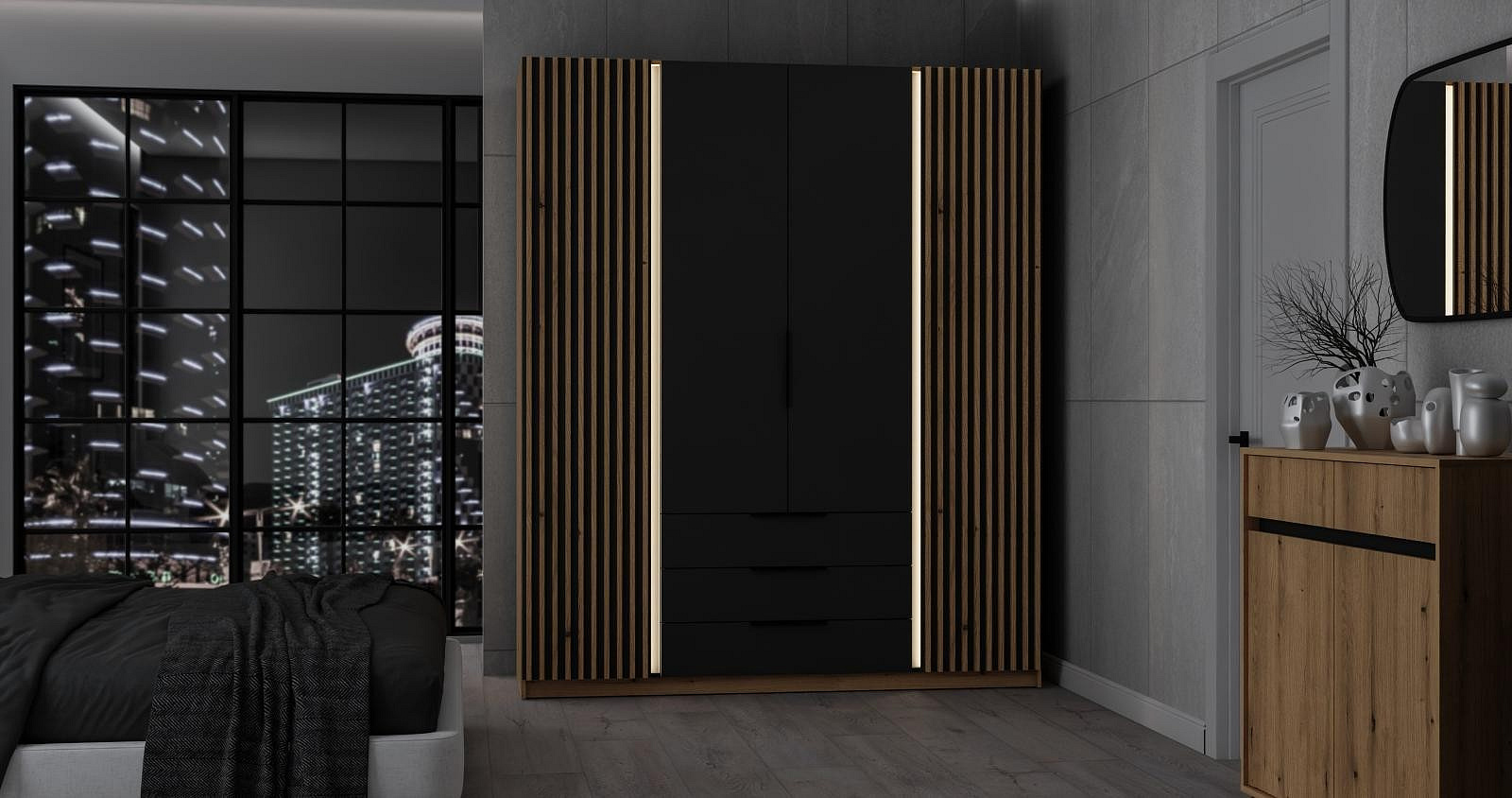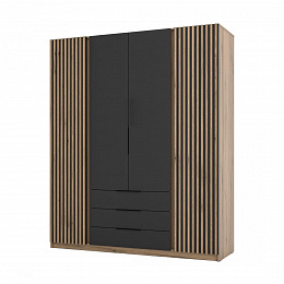 Šatní skříň Keny IV v moderním designu má šířku 200 cm a je rozdělena na tři praktické části. Vnitřní uspořádání kombinuje závěsnou tyč, 11 polic a 3 šuplíky, což umožňuje přehledné a praktické rozdělení šatníku.