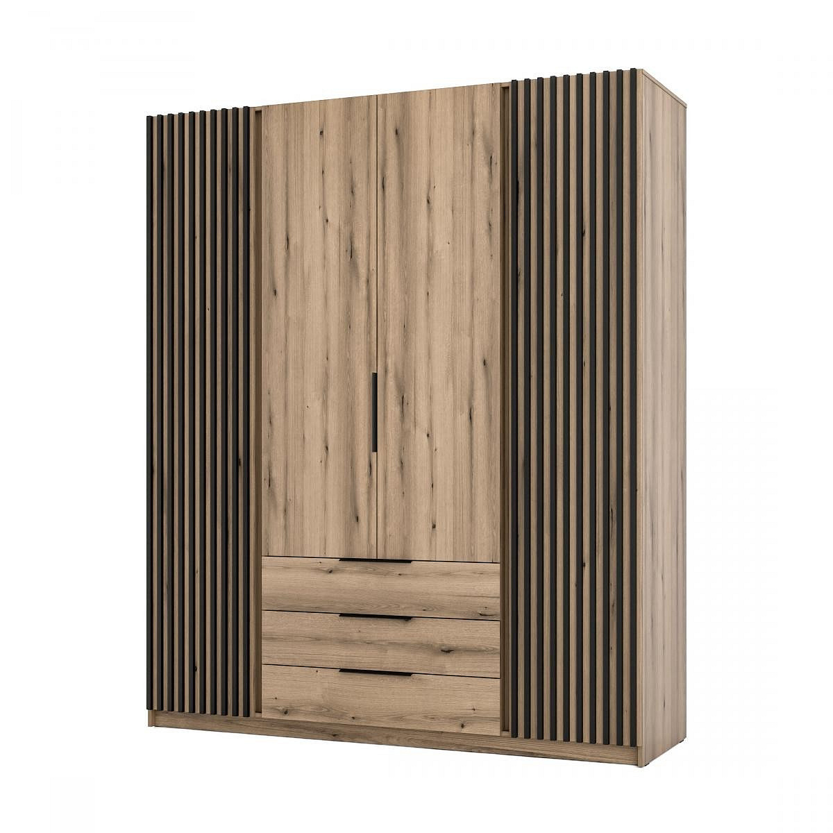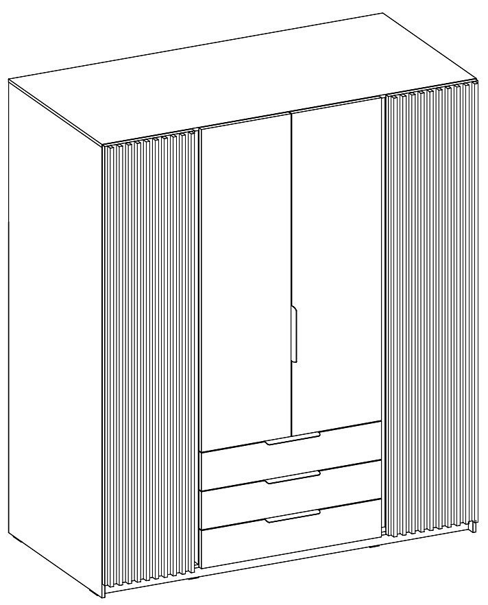 Šatní skříň Keny IV v moderním designu má šířku 200 cm a je rozdělena na tři praktické části. Vnitřní uspořádání kombinuje závěsnou tyč, 11 polic a 3 šuplíky, což umožňuje přehledné a praktické rozdělení šatníku.