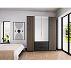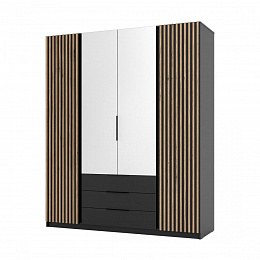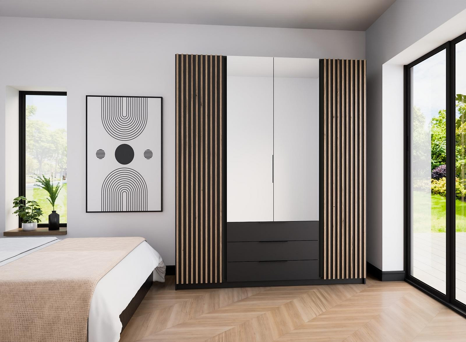 Šatní skříň Keny V v moderním designu má šířku 200 cm a je rozdělena na tři praktické části. Vnitřní uspořádání kombinuje závěsnou tyč, 11 polic a 3 šuplíky, což umožňuje přehledné a praktické rozdělení šatníku.