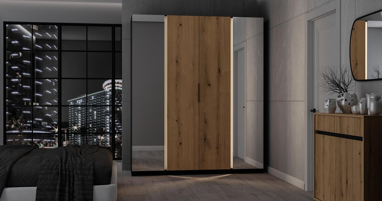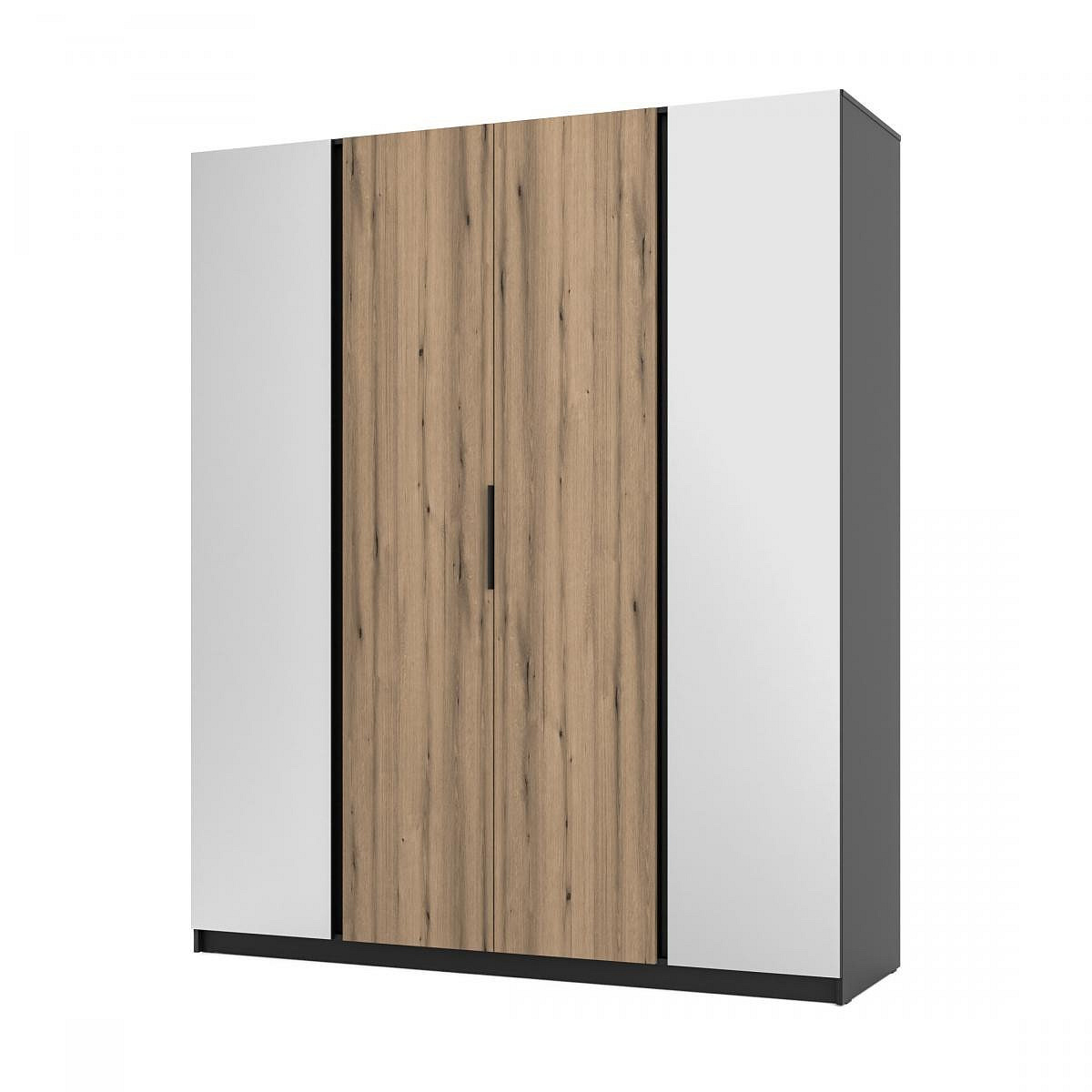 Šatní skříň Keny VIII v moderním designu má šířku 200 cm a je rozdělena na tři praktické části. Vnitřní uspořádání kombinuje závěsnou tyč a 11 polic, což umožňuje přehledné a praktické rozdělení šatníku.