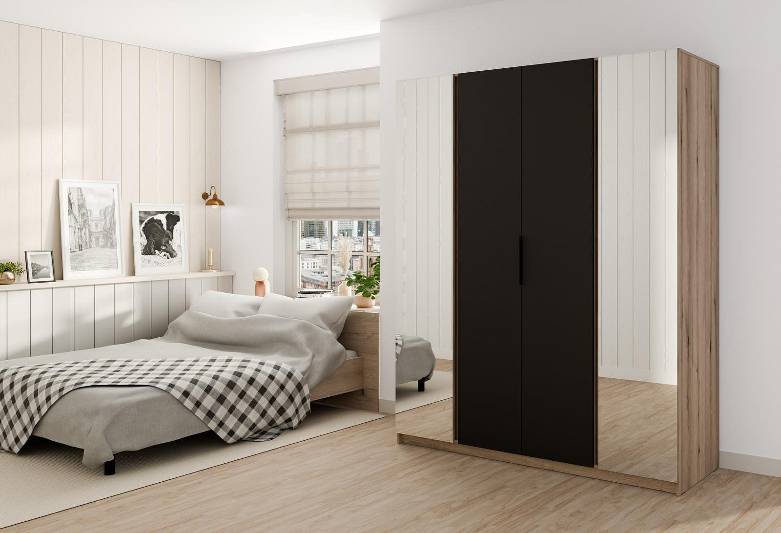 Šatní skříň Keny VIII v moderním designu má šířku 200 cm a je rozdělena na tři praktické části. Vnitřní uspořádání kombinuje závěsnou tyč a 11 polic, což umožňuje přehledné a praktické rozdělení šatníku.