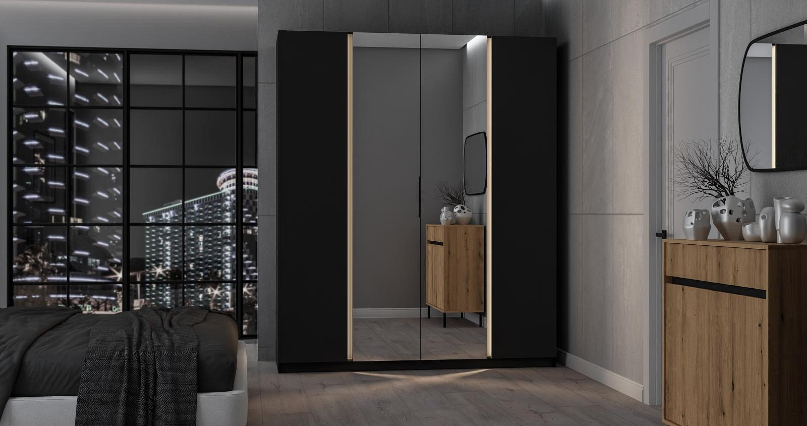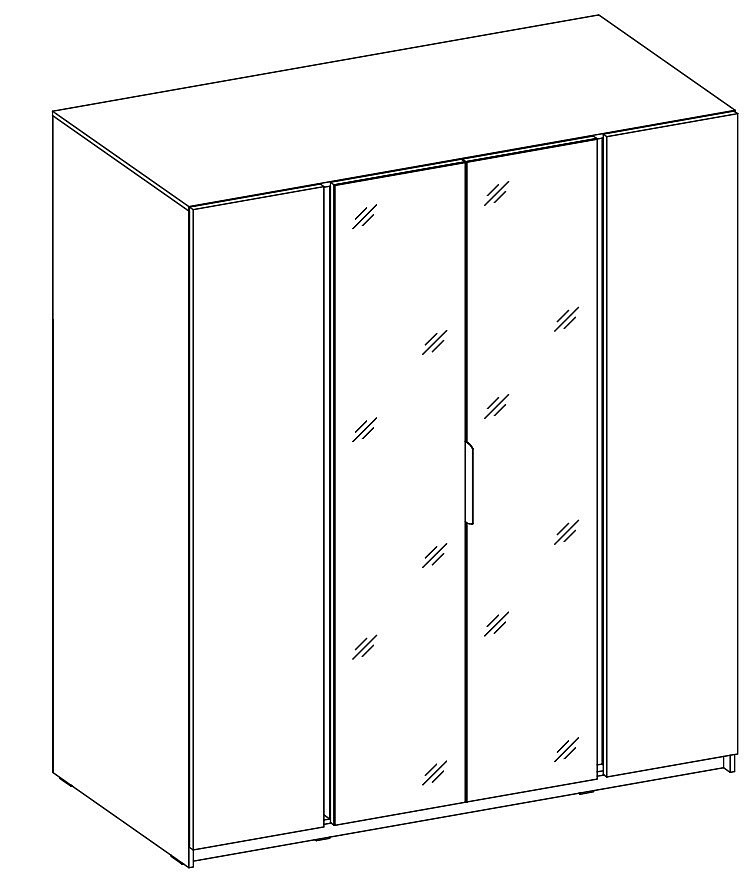 Šatní skříň Keny X v moderním designu má šířku 200 cm a je rozdělena na tři praktické části. Vnitřní uspořádání kombinuje závěsnou tyč a 11 polic, což umožňuje přehledné a praktické rozdělení šatníku.
