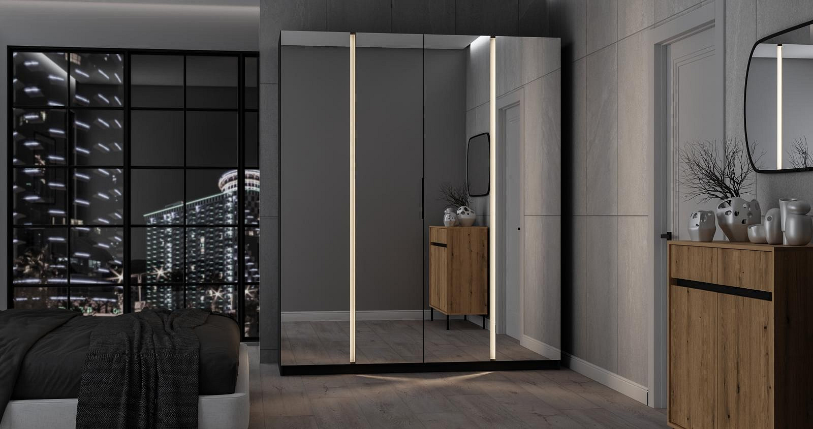 Šatní skříň Keny XI v moderním designu má šířku 200 cm a je rozdělena na tři praktické části. Vnitřní uspořádání kombinuje závěsnou tyč a 11 polic, což umožňuje přehledné a praktické rozdělení šatníku.