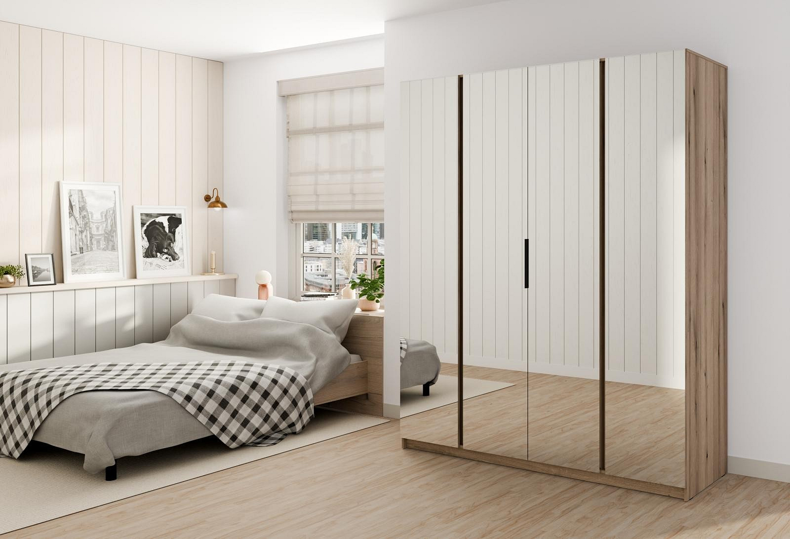 Šatní skříň Keny XI v moderním designu má šířku 200 cm a je rozdělena na tři praktické části. Vnitřní uspořádání kombinuje závěsnou tyč a 11 polic, což umožňuje přehledné a praktické rozdělení šatníku.